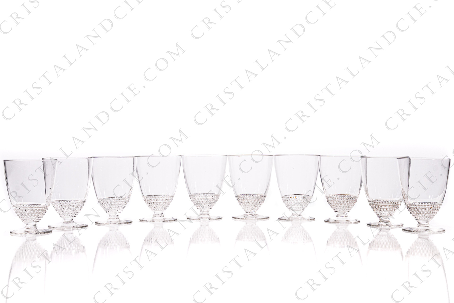 Set of ten sherry glasses n°5 in crystal by Lalique pattern Nippon decorated with friezes of pearls on the gob. Pattern created by Rene Lalique in 1930. Stamped.