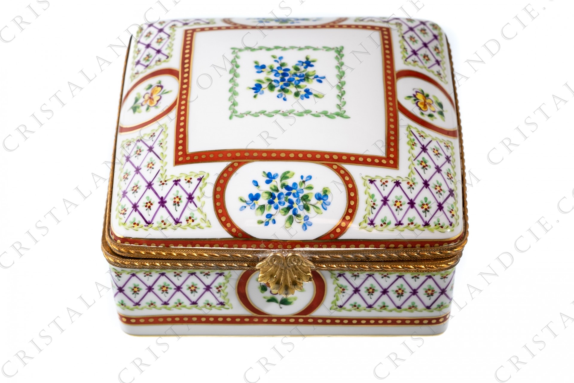 Towering box in china hand painted by the workshops Le Tallec decorated with pansies and blue and red flowers. Frame in brass, closure as a leaf. Dating from 1962.