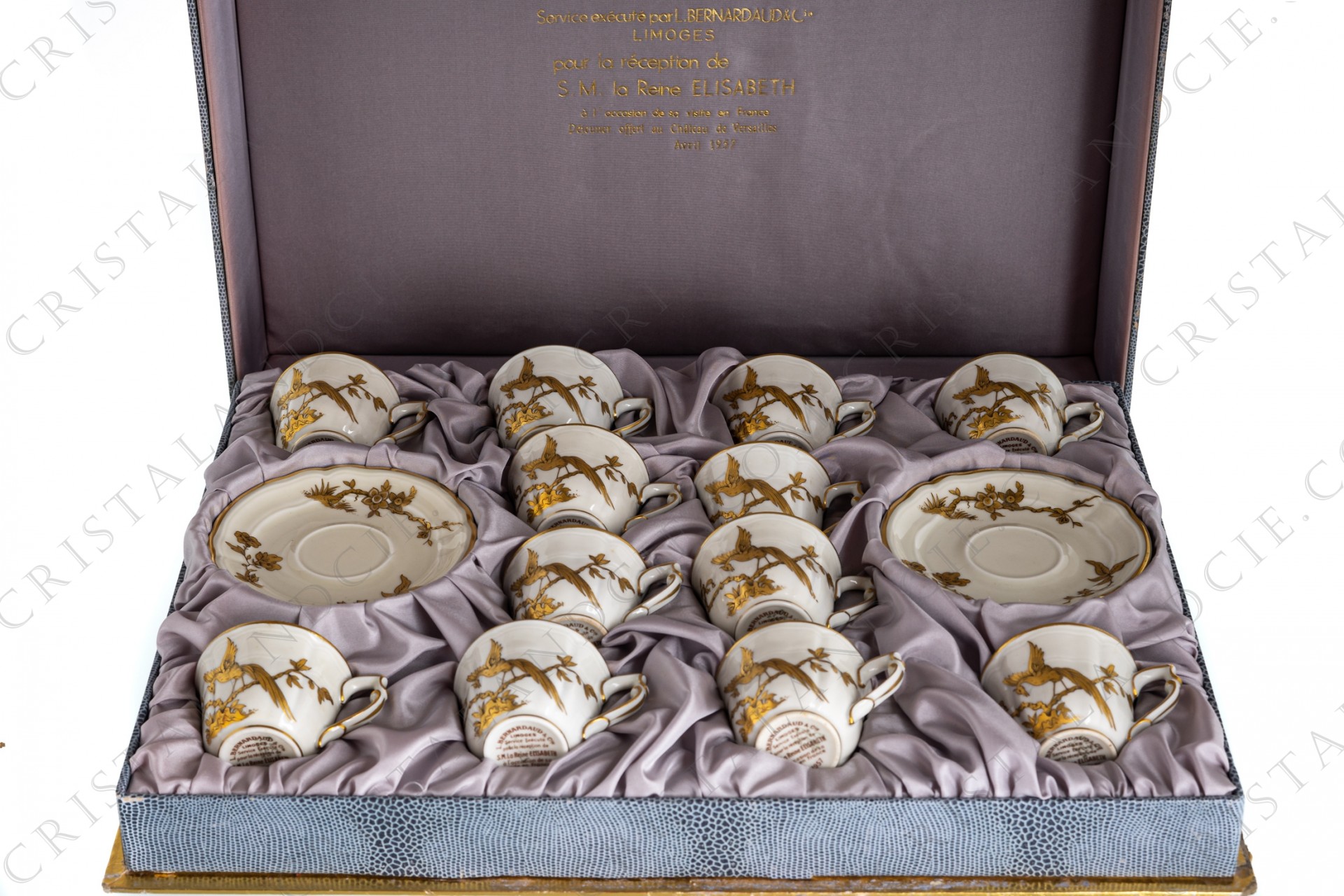 Set of twelve moka cups in china of Limoges by Bernardaud pattern Reine Elisabeth decorated with gold birds of paradise and branches. Pattern created in 1957 for the reception of Her Majesty The Queen Elisabeth at the occasion of her visiting in France. Sold in their original box.