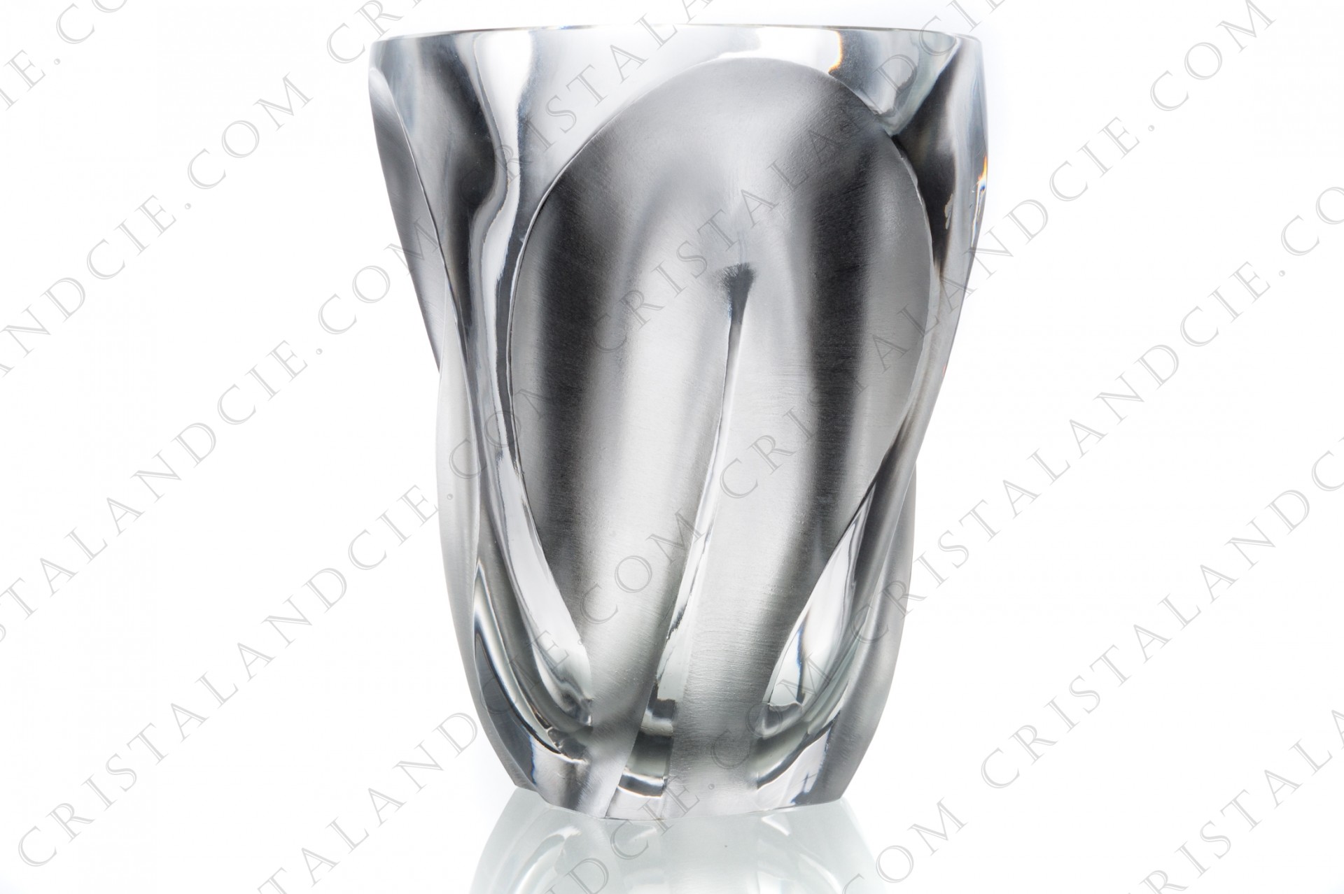 description: Vase in clear and frosted crystal by Lalique pattern Ingrid, with a cut pattern of leaves. Pattern created by Marc Lalique in 1970. A tiny chip on the bottom, scratches under. Height: 10,39 in Diameter: 8,26 in.