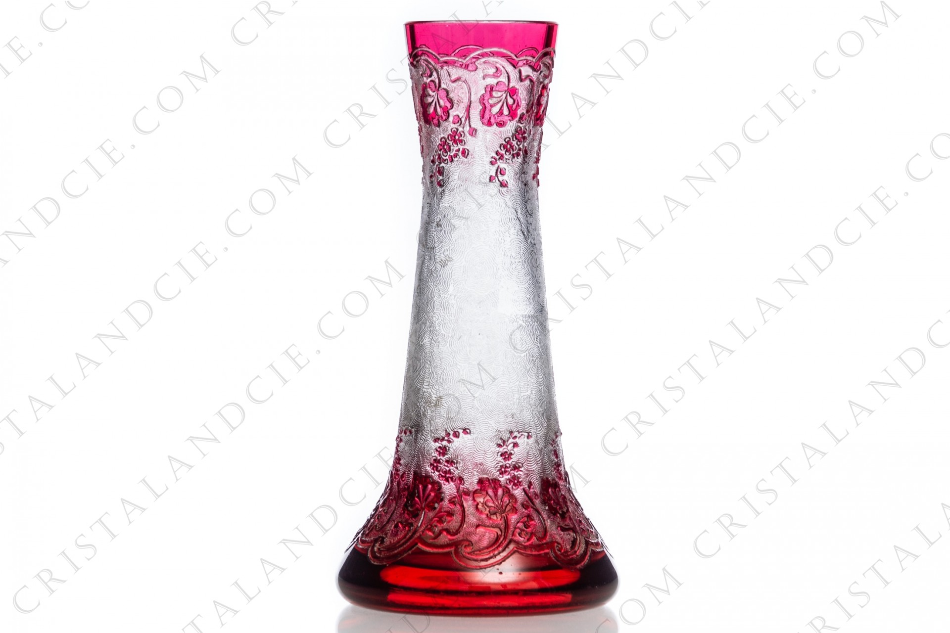 description: Vase in clear and pink double layer crystal by Baccart engraved in the acid decorated with flowers. Dating from the 1900th. Few scratches under. Height: 6,57 in Diameter: 3,23 in.