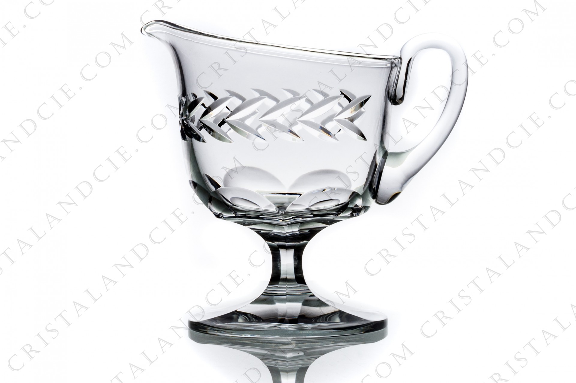 Water jug in crystal by Lalique pattern Beauharnais decorated with flat cuts on the bottom of the parison and on the foot, frieze of leaves on the parison.