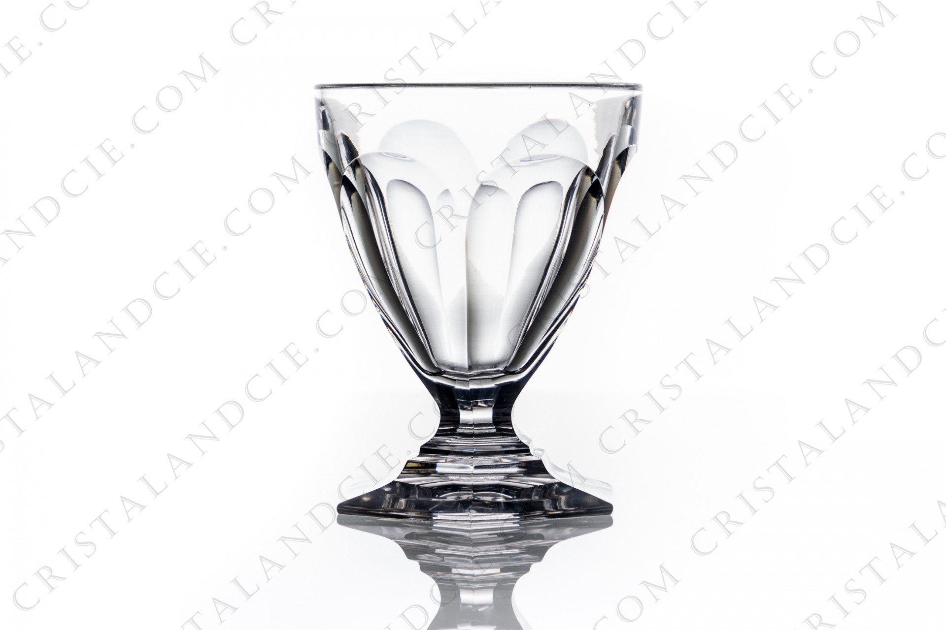 Wine glass n°3 in crystal by Baccarat pattern Bourbon decorated with flatcut, hexagonal foot. Pattern produced from 1937 to 1970. Rares usury marks. Height: 4,06 in Diameter: 3,15 in.
