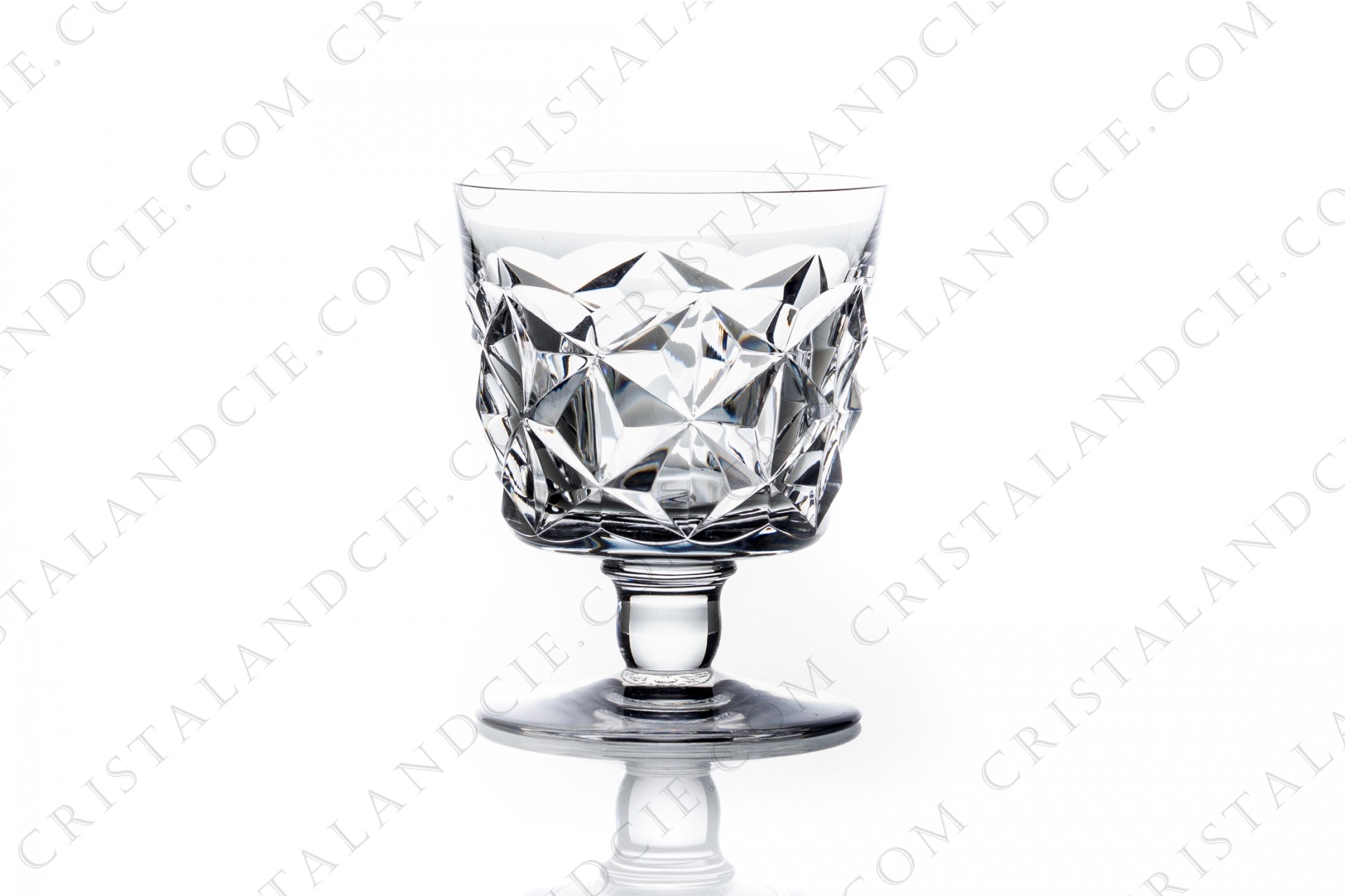 Wine glass n°4 in crystal by Baccarat pattern Muret with an important cut pattern. Pattern produced from 1948 to 1961. Rares tiny scratches. Height: 3,19 in Diameter: 2,56 in.