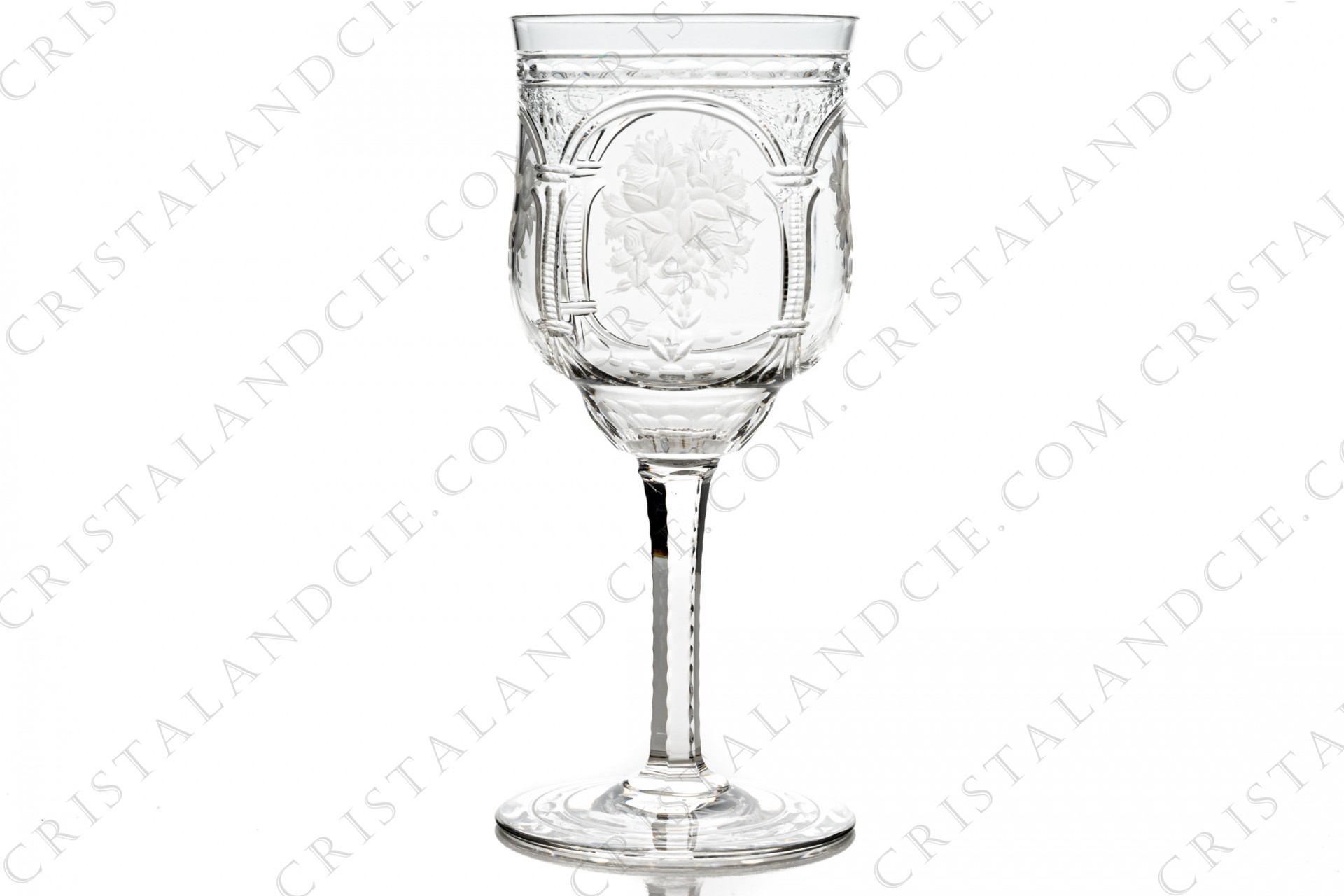 White wine glass n°4 in crystal by Baccarat pattern Vallée S with a pattern of engraved and frosted bouquets of flowers framed by arches and columns. Pattern produced from 1923 to 1999. Stamped.