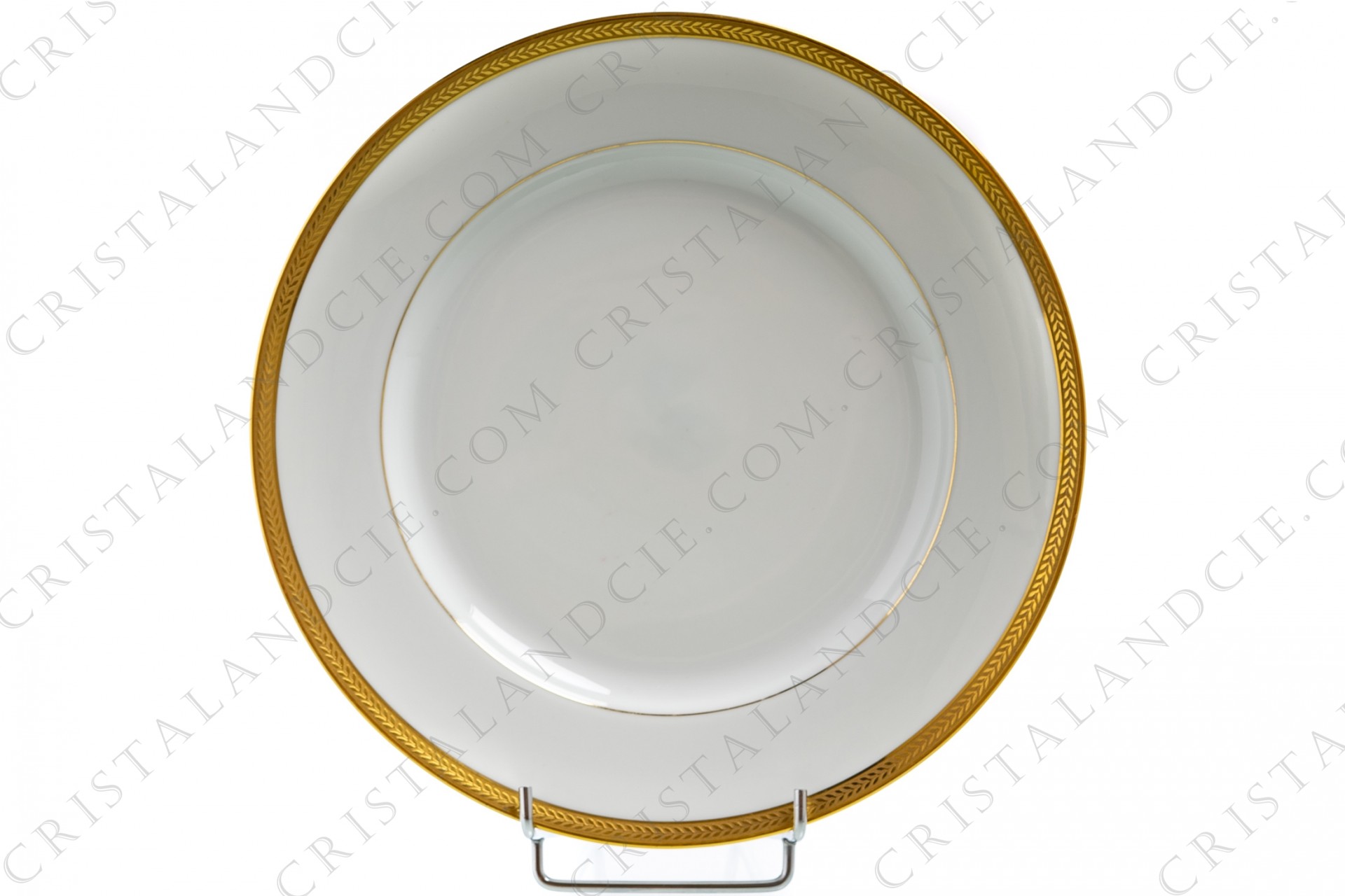 Assiette plate en porcelaine de Limoges de la maison Lafarge ornée d'une frise de feuilles de lauriers en incrustations or.