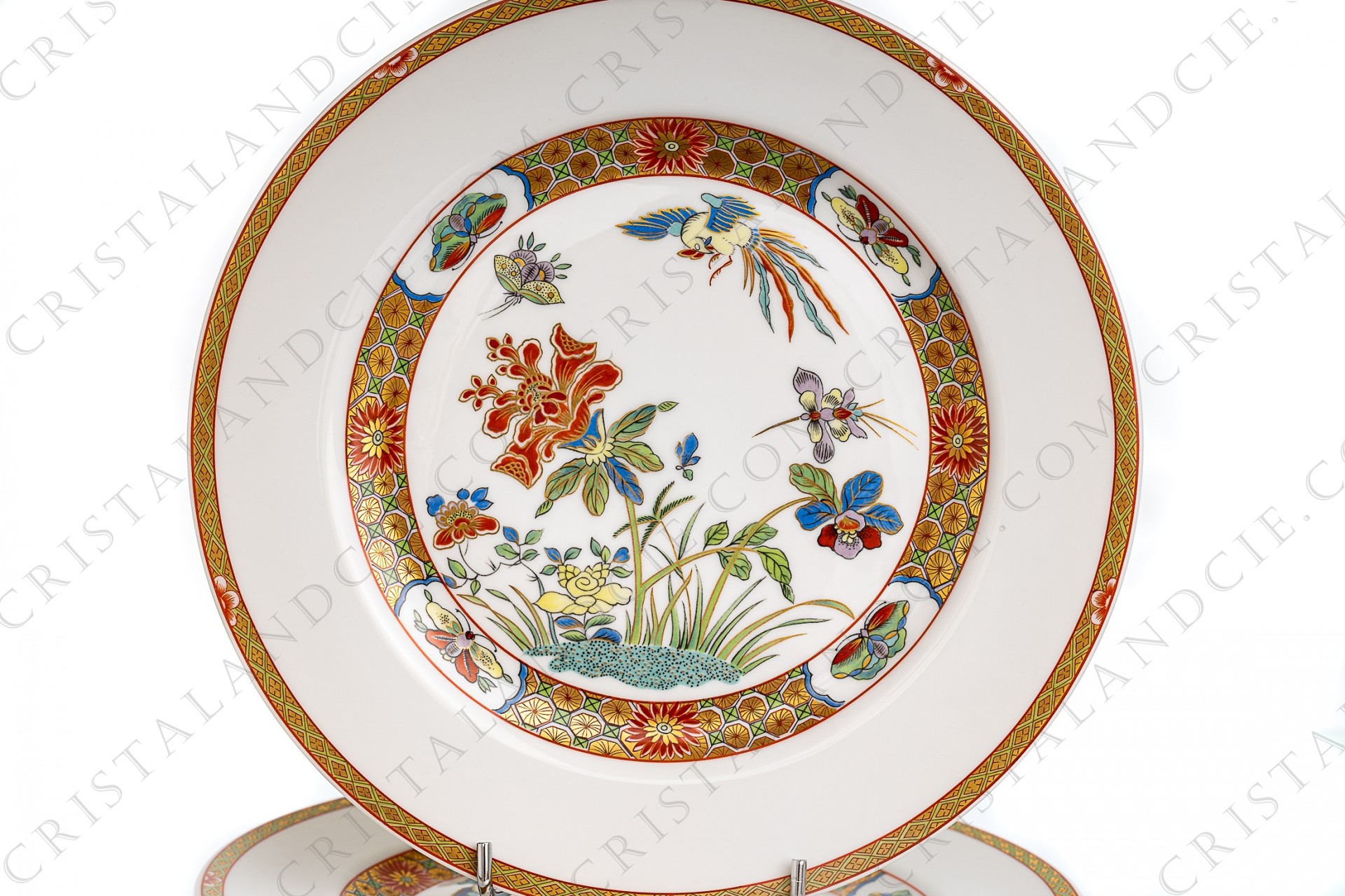 Assiette plate en porcelaine de Limoges de la maison Bernardaud modèle Chef d'Œuvre ornées de fleurs et oiseau de paradis polychromes et or et de frises de fleurs et papillons, inspiré d'un décor de de la manufacture impériale de porcelaine King-Tö-Tchen du début du XVIIIè siècle.