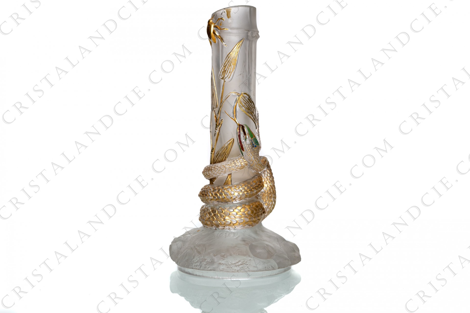 Bougeoir en cristal moulé et dépoli de Baccarat modèle au serpent représentant une tige de bambou sur un rocher autour de laquelle s'enroule un serpent or dont la tête est émaillée. Présence d'une branche de bambous et d'un hanneton or. Datant des années 1890. Estampillé.