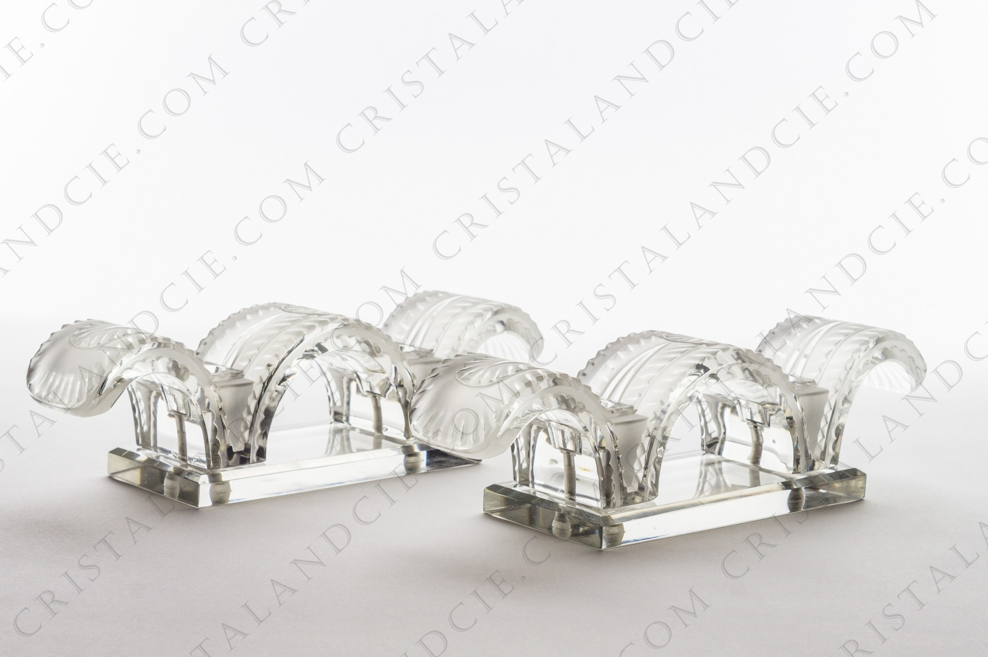 Paire de bougeoirs en cristal de Lalique modèle Porquerolles représentant des palmiers en cristal poli et dépoli, sur un socle en cristal clair. Modèle créé par René Lalique en 1944.