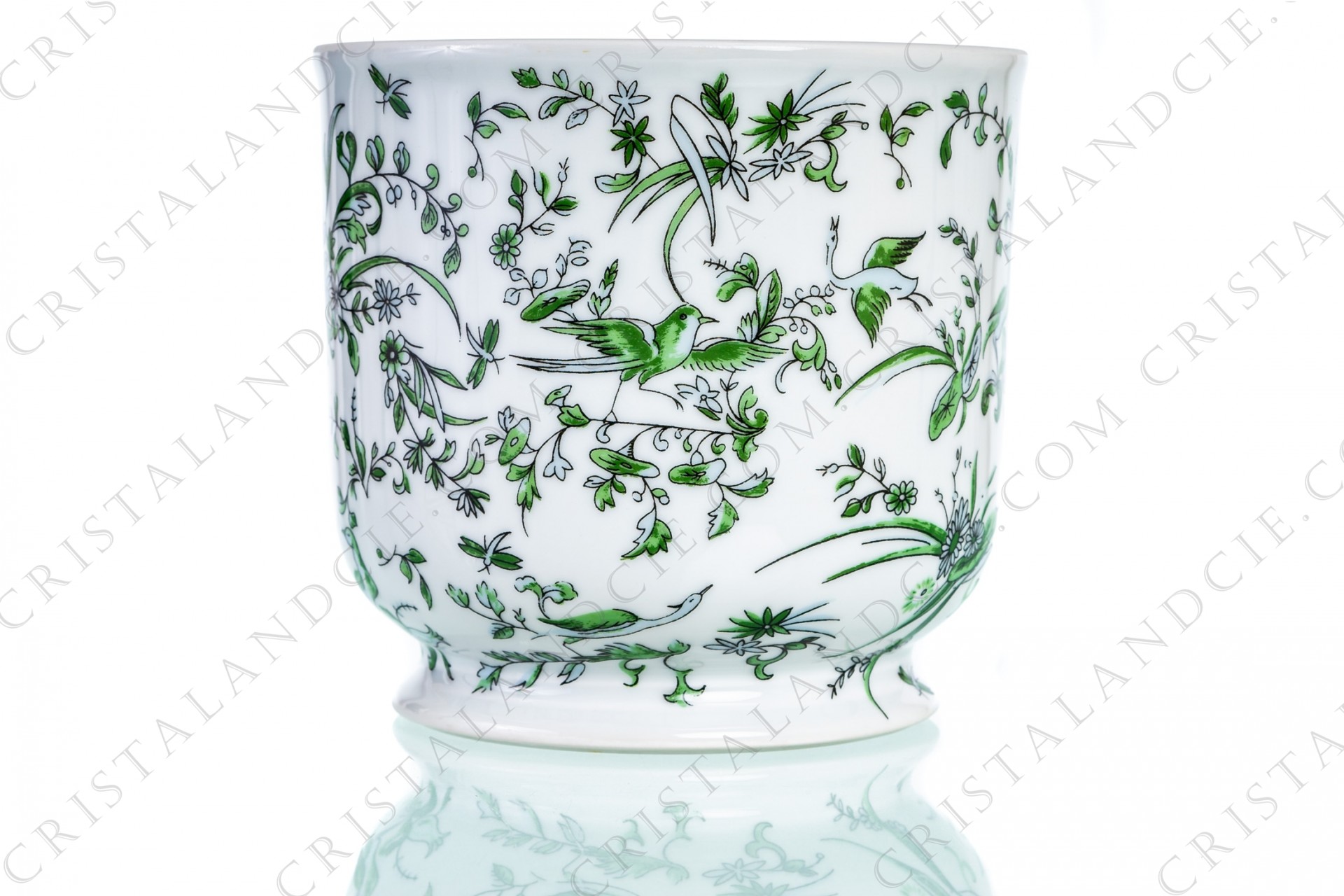 Cache pot en porcelaine de Limoges de la maison Bernardaud modèle Parsifal orné d'oiseaux sur des branchages fleuris en camaïeu de verts.