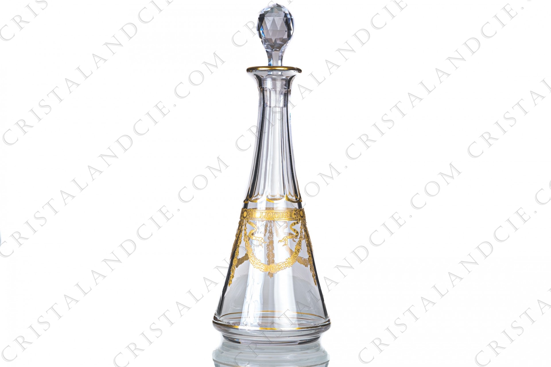 Carafe à liqueur en cristal de Saint-Louis réalisée pour la distillerie Secrestat à Bordeaux, ornée de noeuds et guirlandes de fleurs en incrustations or. Datant de la première moitié du XXè siècle. Trop ancienne pour être estampillée.