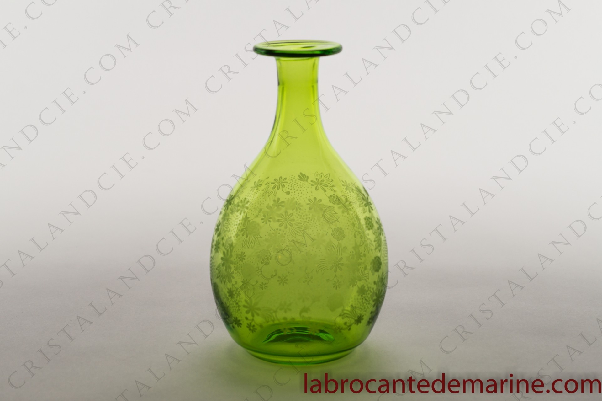 Carafe à vin en cristal vert de Baccarat modèle Elisabeth, orné de fleurs gravées sur toute la panse. Modèle datant des années 1930. Rares micro-rayures, manque le bouchon. Ht: 19,5 cm Diam: 11 cm.