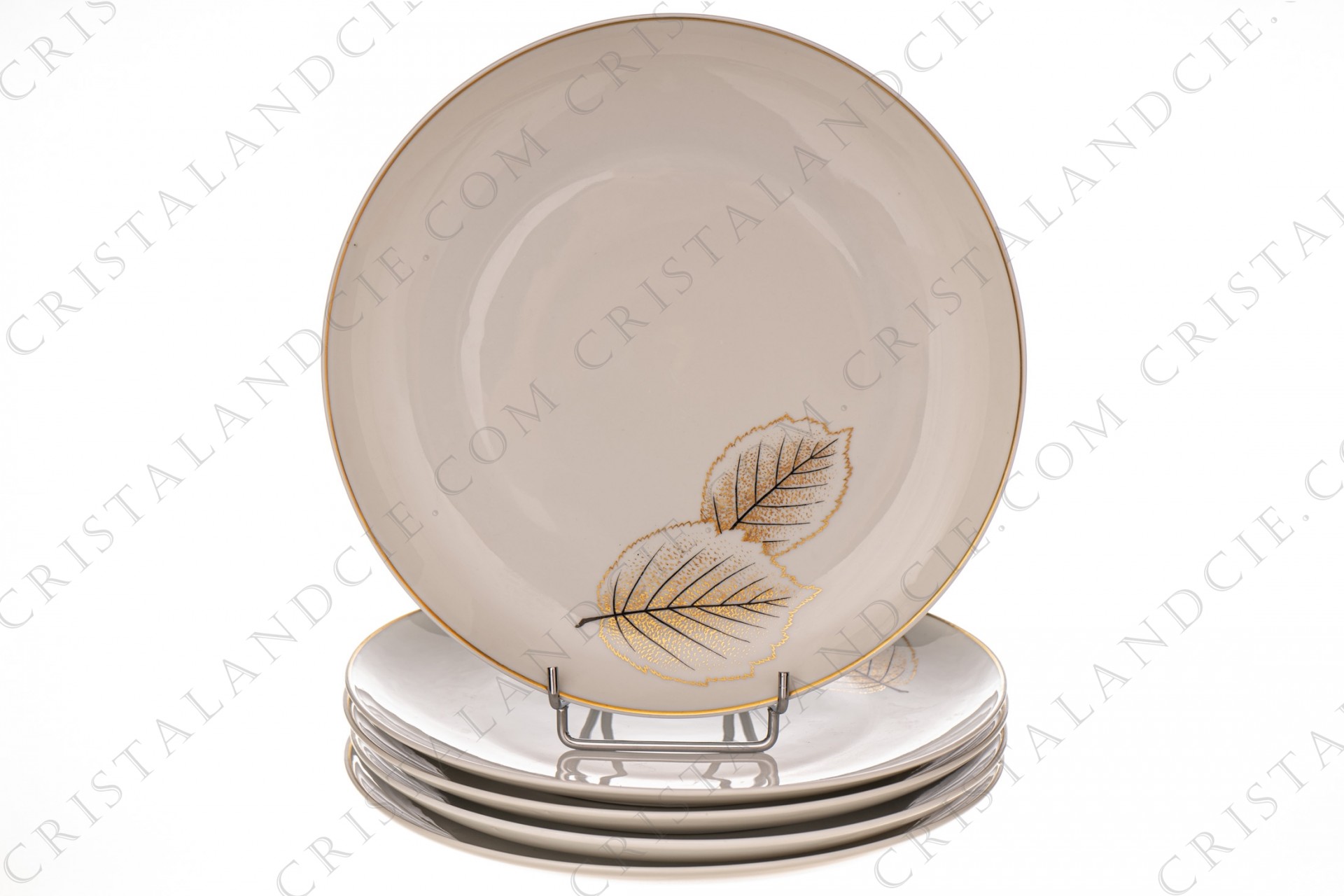 Série de cinq assiettes plates en porcelaine de Limoges de la maison Bernardaud modèle Catherine créé par Nicole Desjardin, ornées de feuilles or et noir.