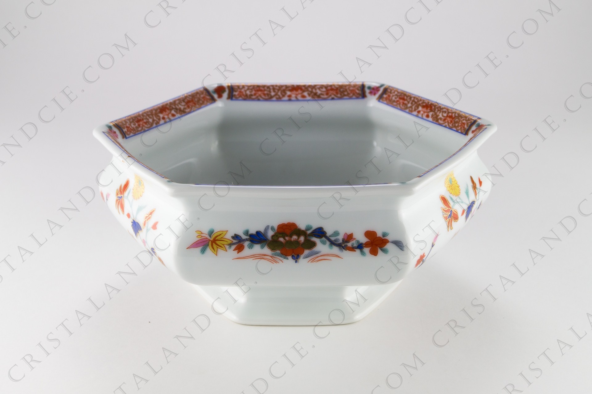Coupe hexagonale en porcelaine de Limoges de la maison Bernardaud modèle Pondichéry à décor de fleurs polychromes et dorées.
