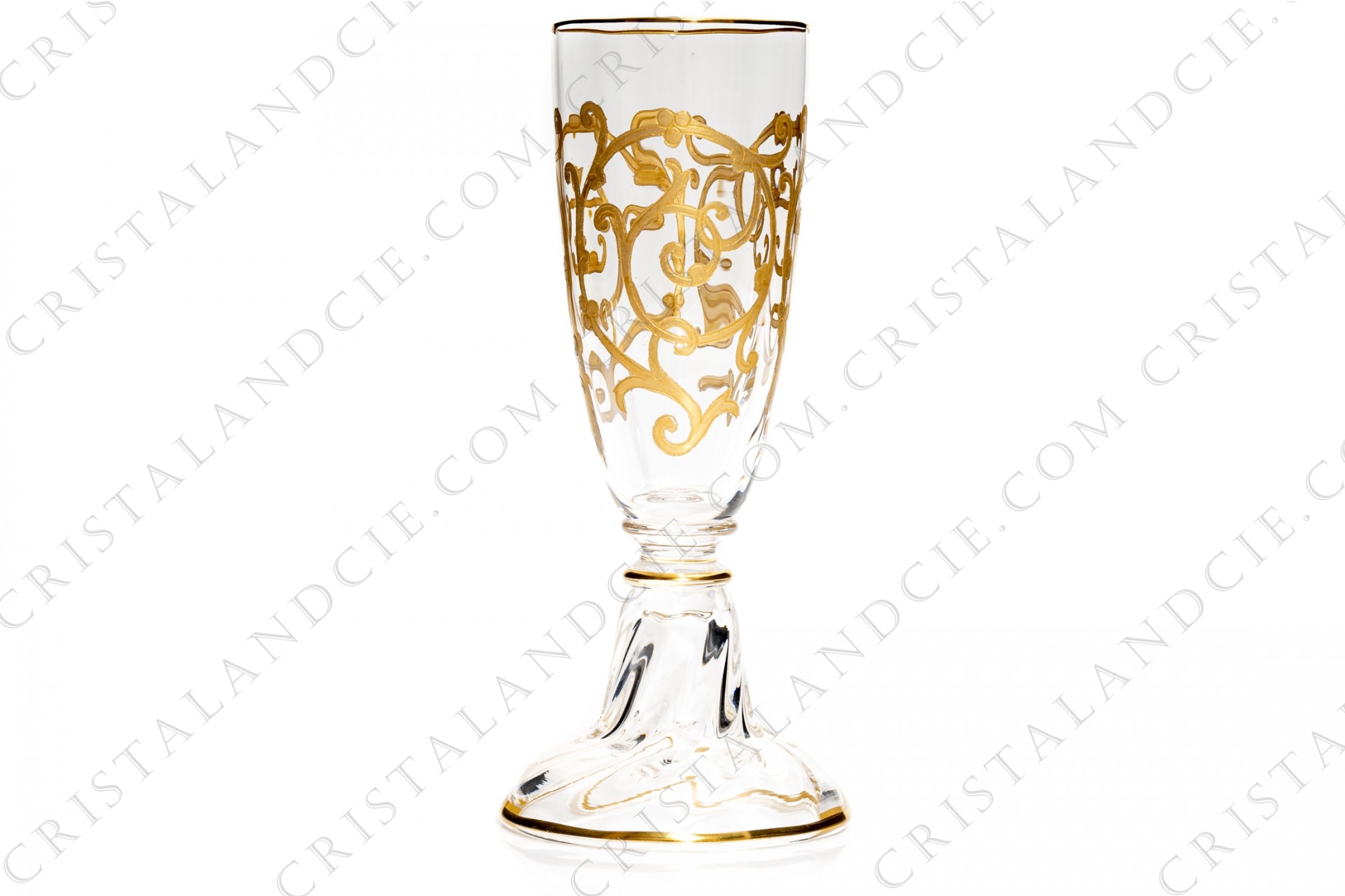 Flûte à Champagne en cristal de Saint-Louis modèle Cluny, inspiré d'une ancienne forme vénitienne, muni d'un pied creux, orné de côtes vénitiennes et d'arabesques en incrustations or. Modèle créé en 1889. Estampille peu visible.