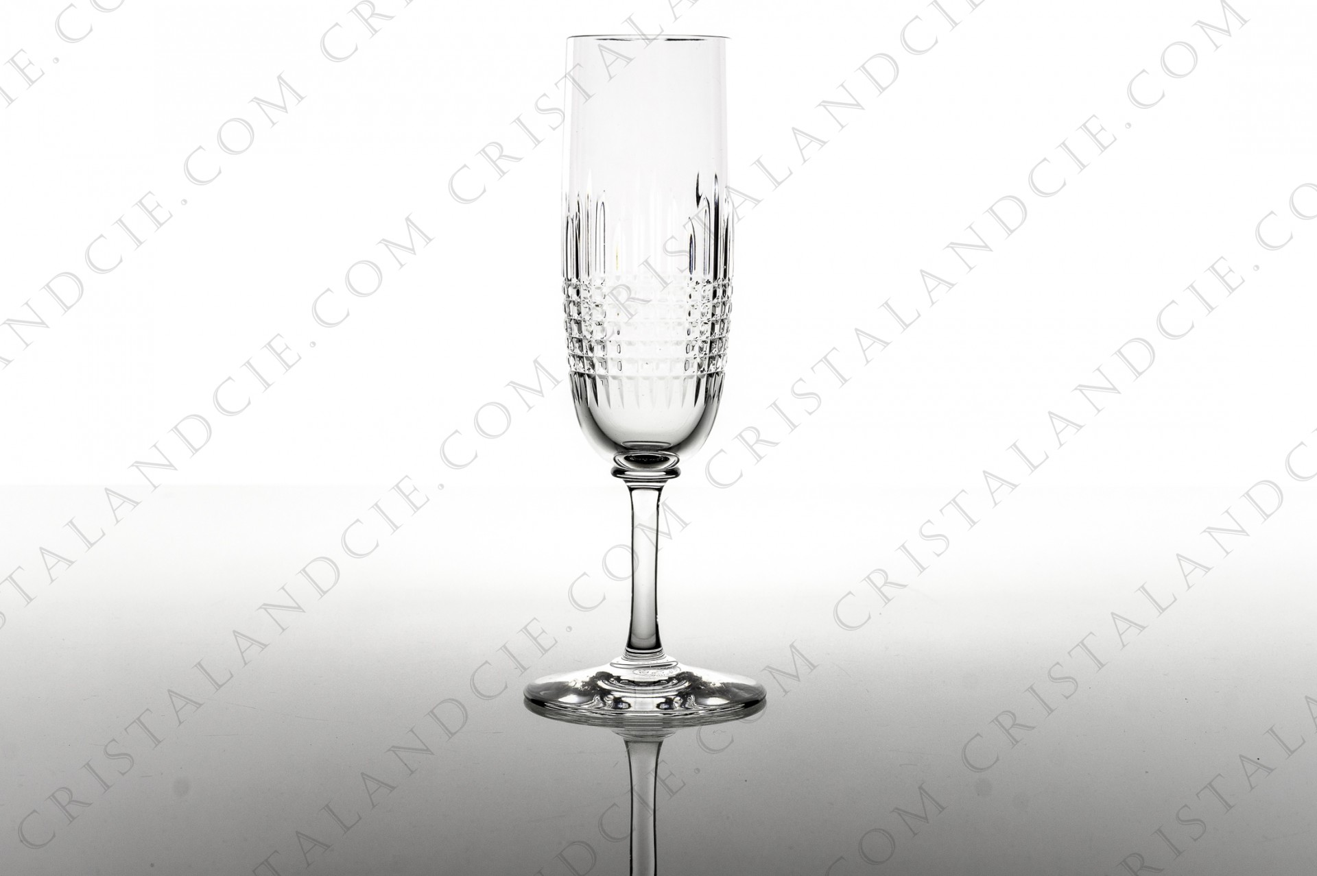 Flûte à Champagne en cristal de Baccarat modèle Nancy présentant un important décor taillé de quadrillage. Modèle produit de 1909 à 2002.