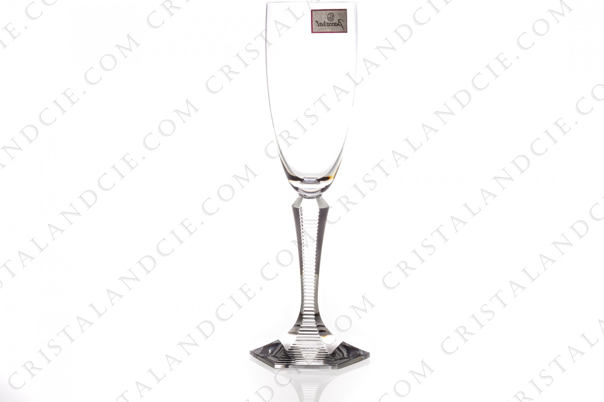 Flûte à Champagne en cristal de Baccarat modèle Opéra dont la jambe et le pied sont ornés de côtes plates et de stries sur une côte. Modèle produit 1991 à 1999.