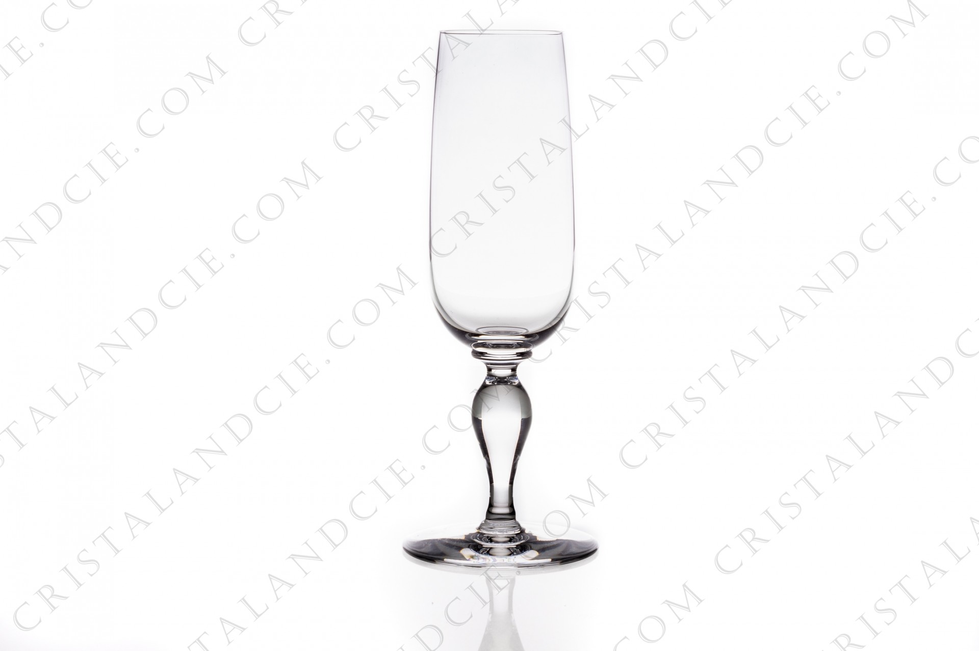 Flûte à Champagne en cristal de Baccarat modèle Romane présentant une jambe balustre. Modèle produit de 1992 à 1996.