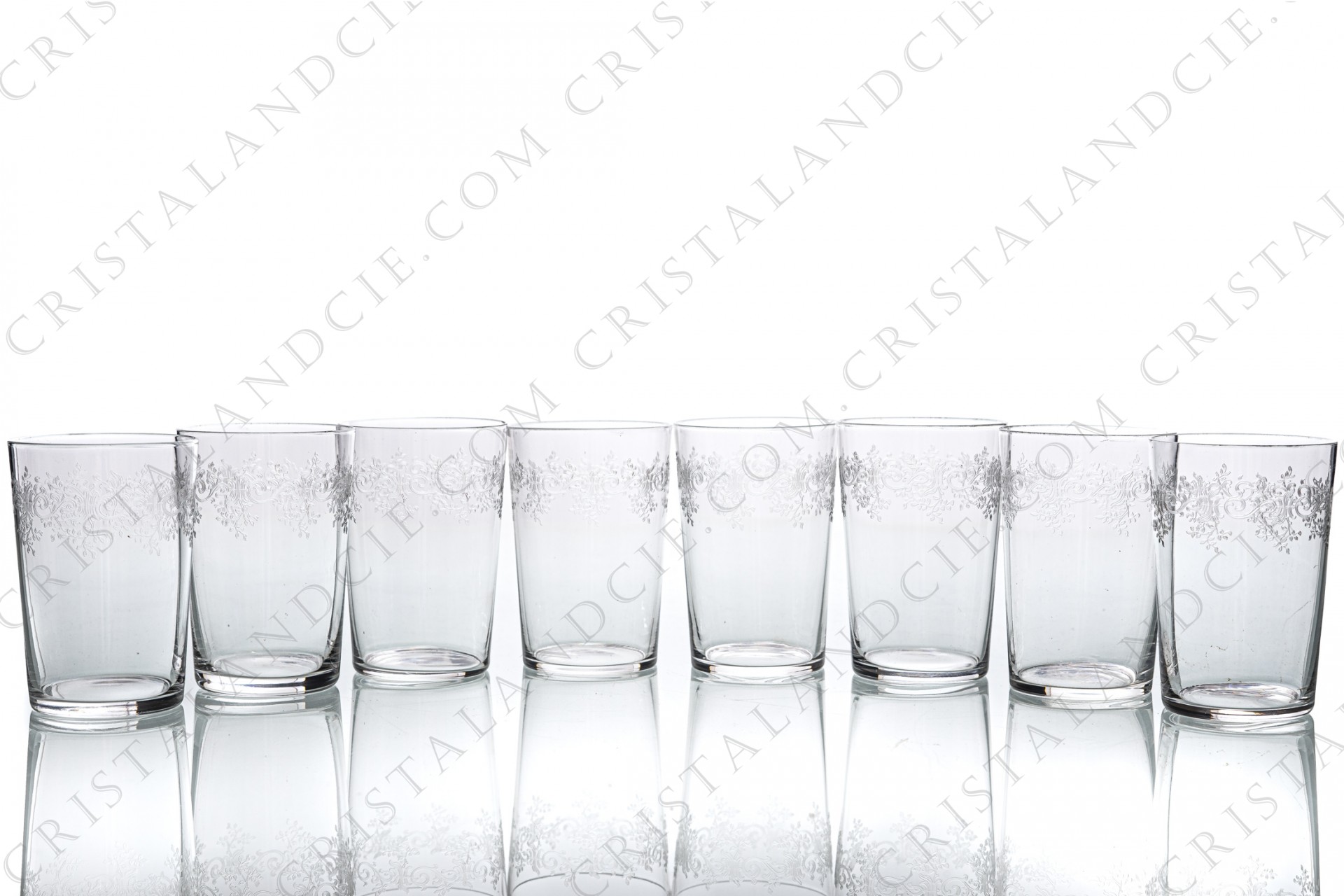 Série de huit petits gobelets en cristal de Baccarat modèle Sévigné présentant un décor d'arabesques gravé. Modèle créé en 1899. Trop anciens pour être estampillés.