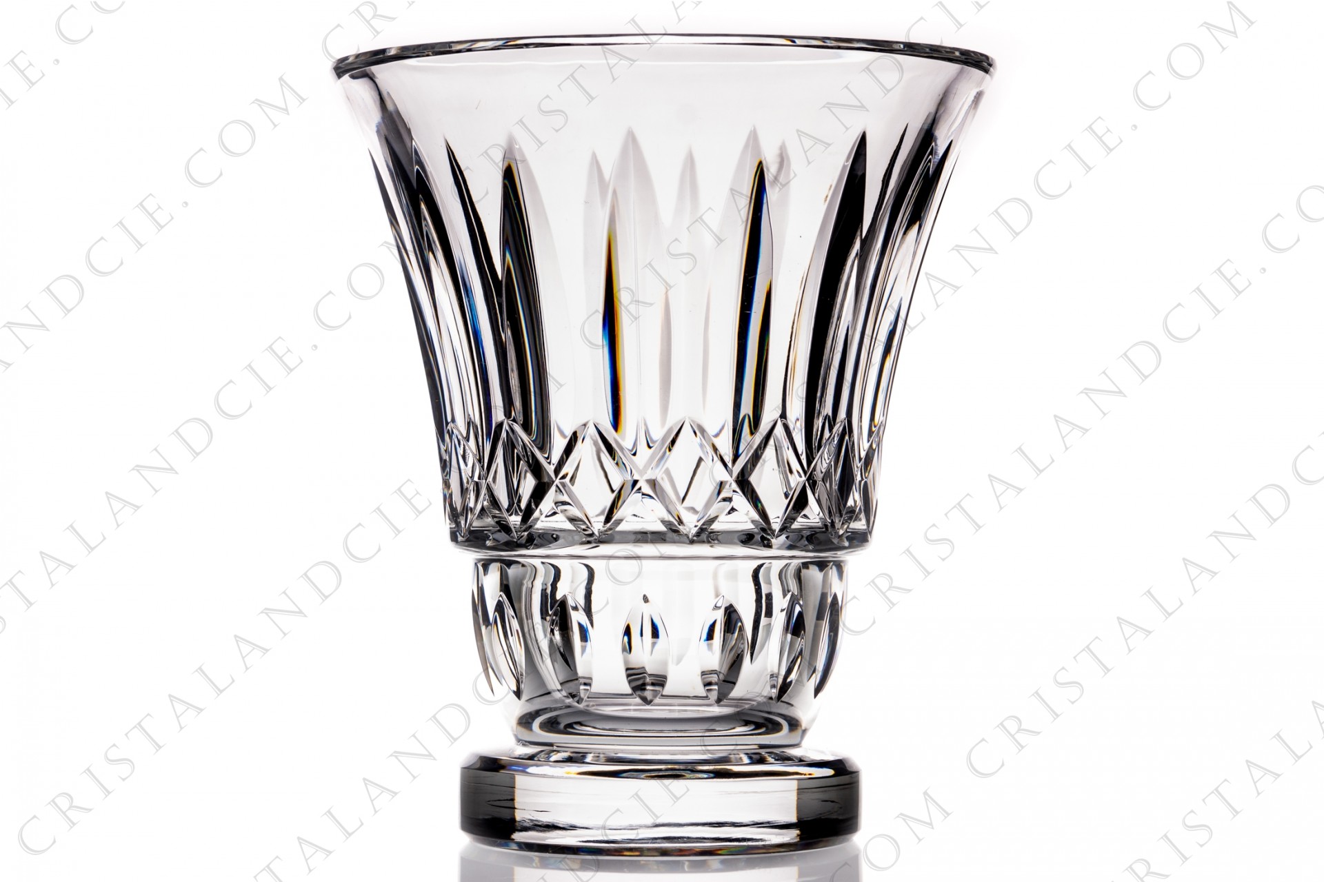 Imposant vase en cristal de Baccarat à décor taillé sur la panse et muni d'un pied. Présent sur le catalogue de 1950. Rares micro-éclats sur le col, quelques micro-rayures. Ht: 28,3 cm Diam: 24,4 cm.