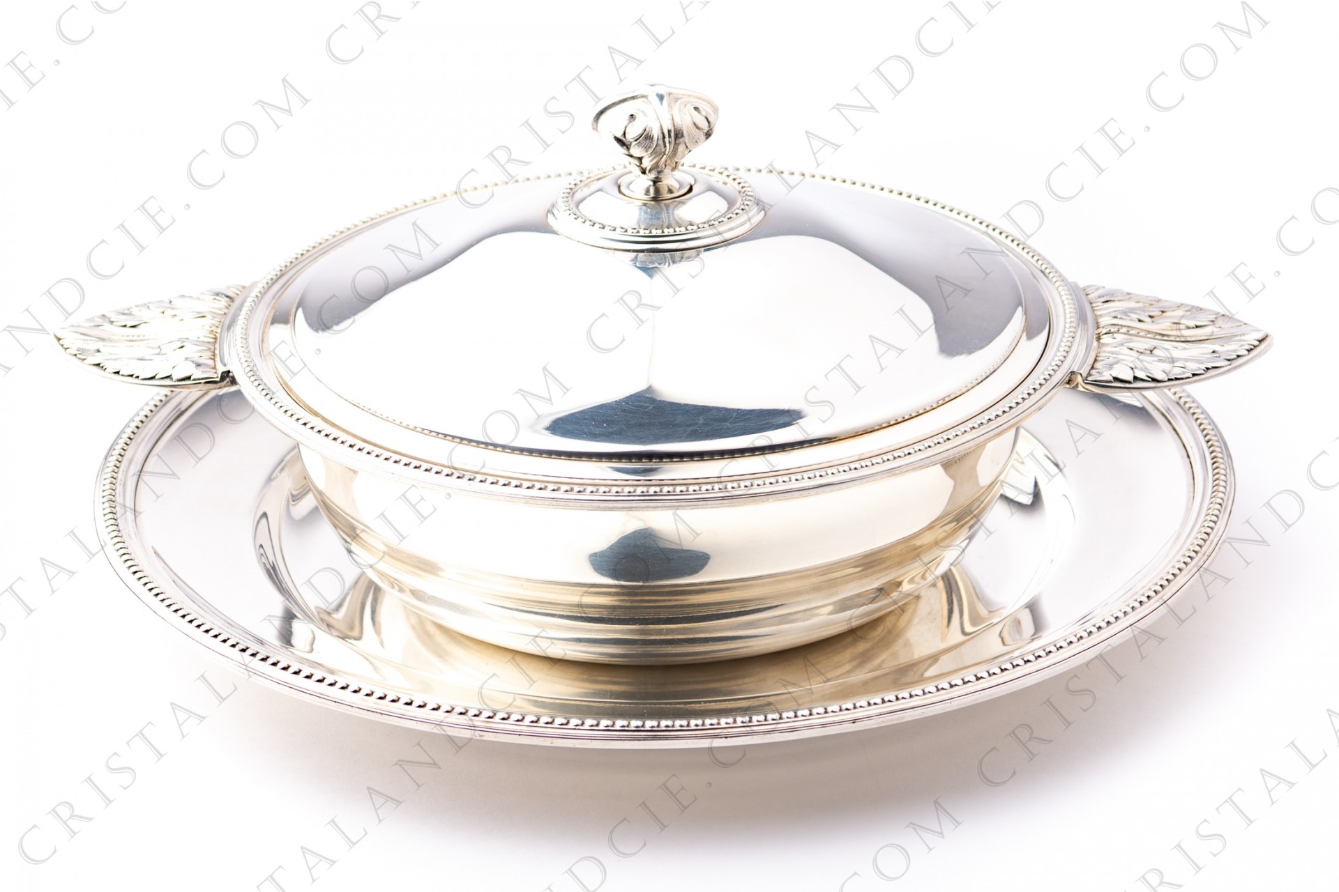 Légumier et son dormant en métal argenté de Christofle, collection Gallia modèle Perles, à décor de rangées de perles et prises de mains végétales.