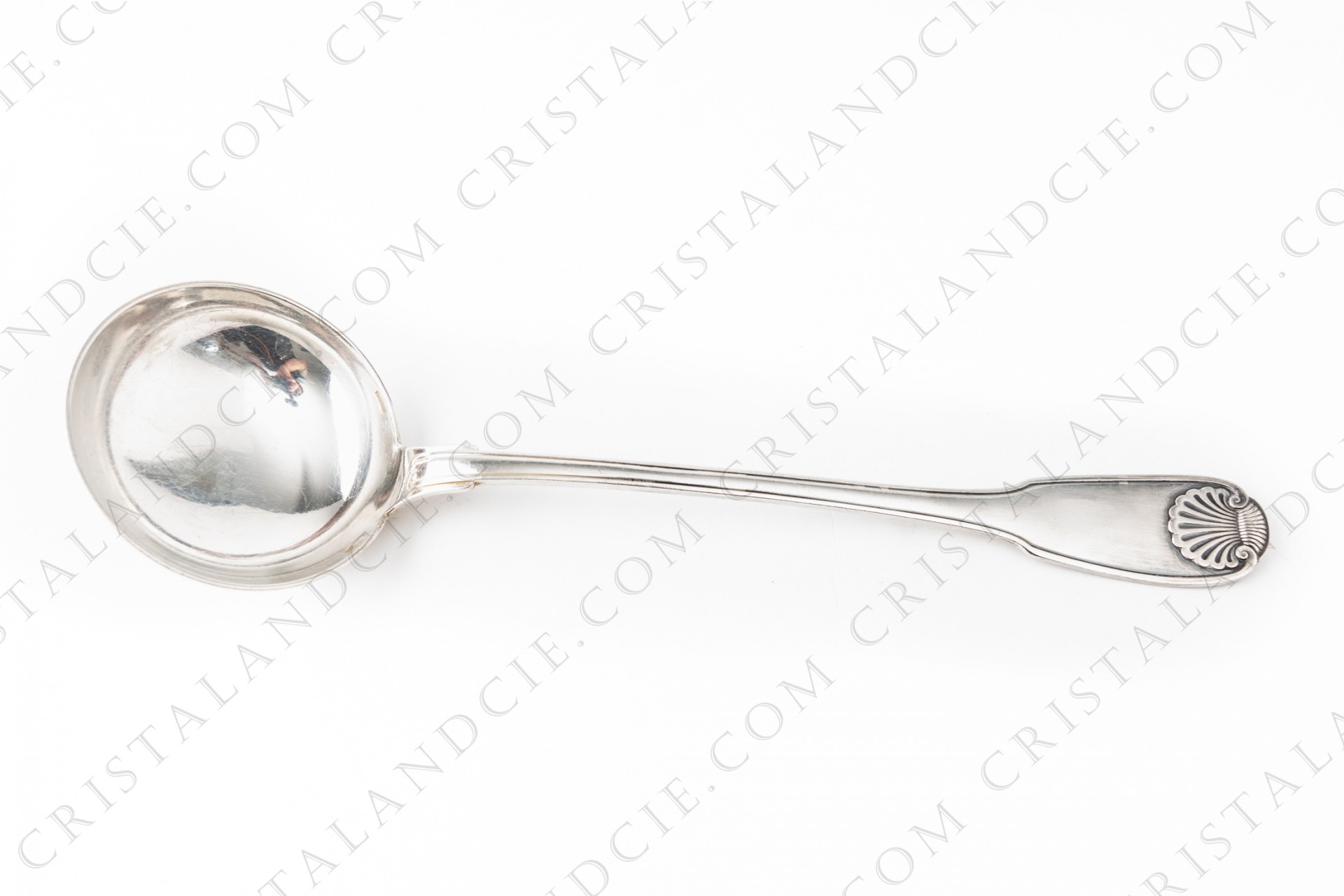 Louche en métal argenté de la maison Christofle modèle Vendôme à décor de coquille.