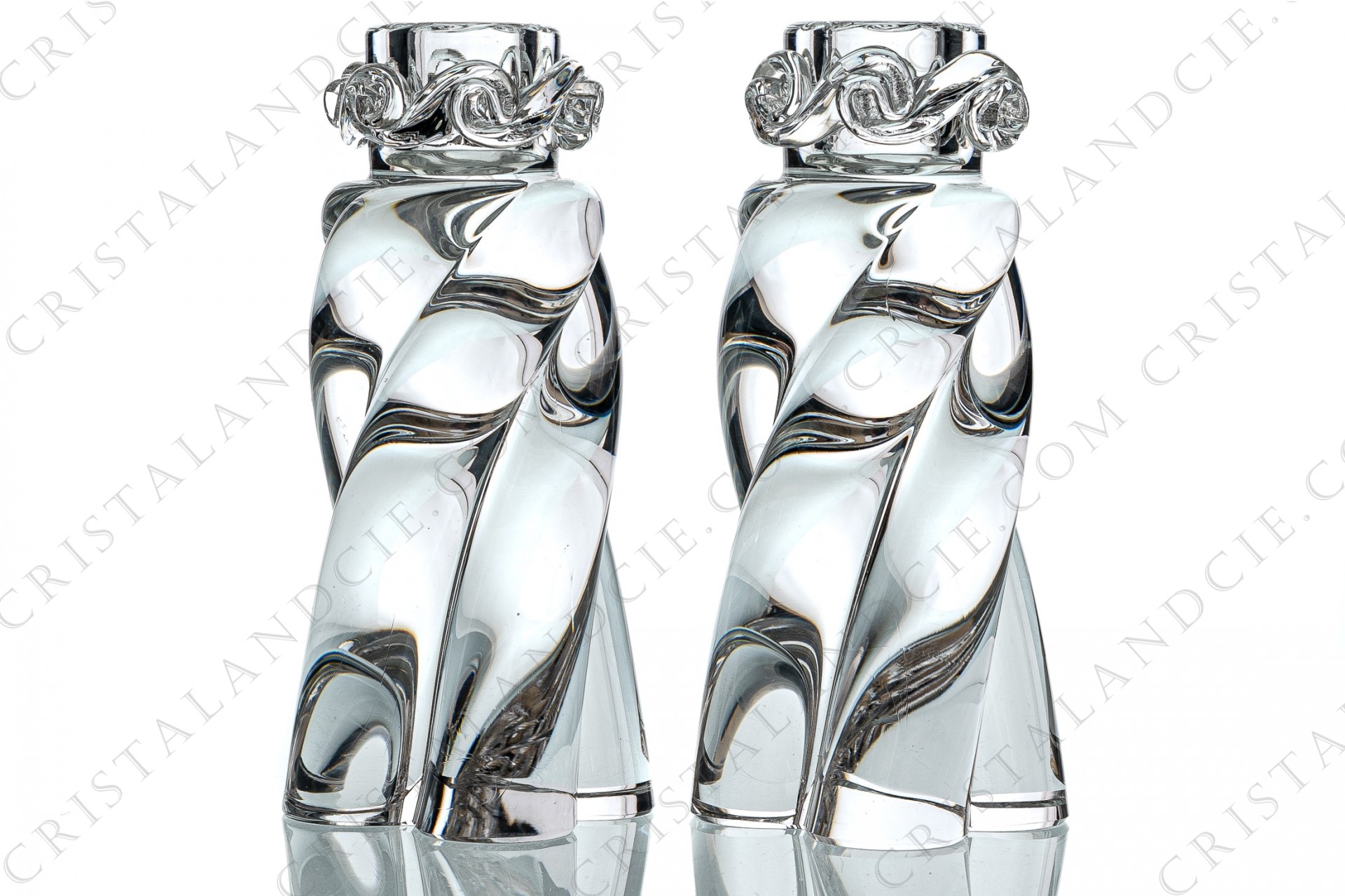 Paire de bougeoirs en cristal de Baccarat modèle Aladin à corps torsadé et frise de volutes en haut. Datant des années 1930. Estampillés.