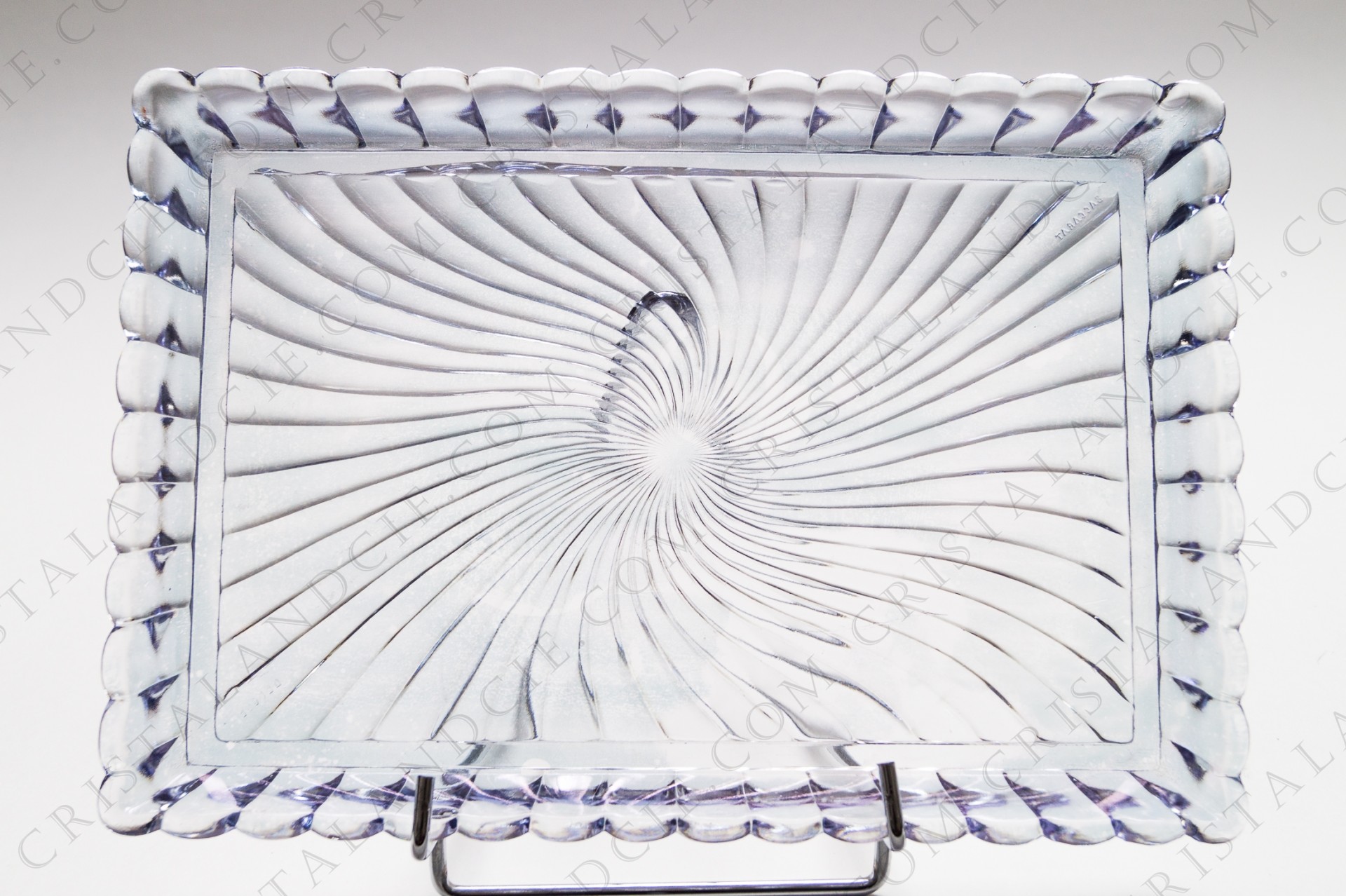 description: Plateau en cristal de Baccarat modèle Bambou Tors à reflets bleutés. Quelques rayures. Ht: 2,5 cm l: 31 cm L: 21,5 cm.