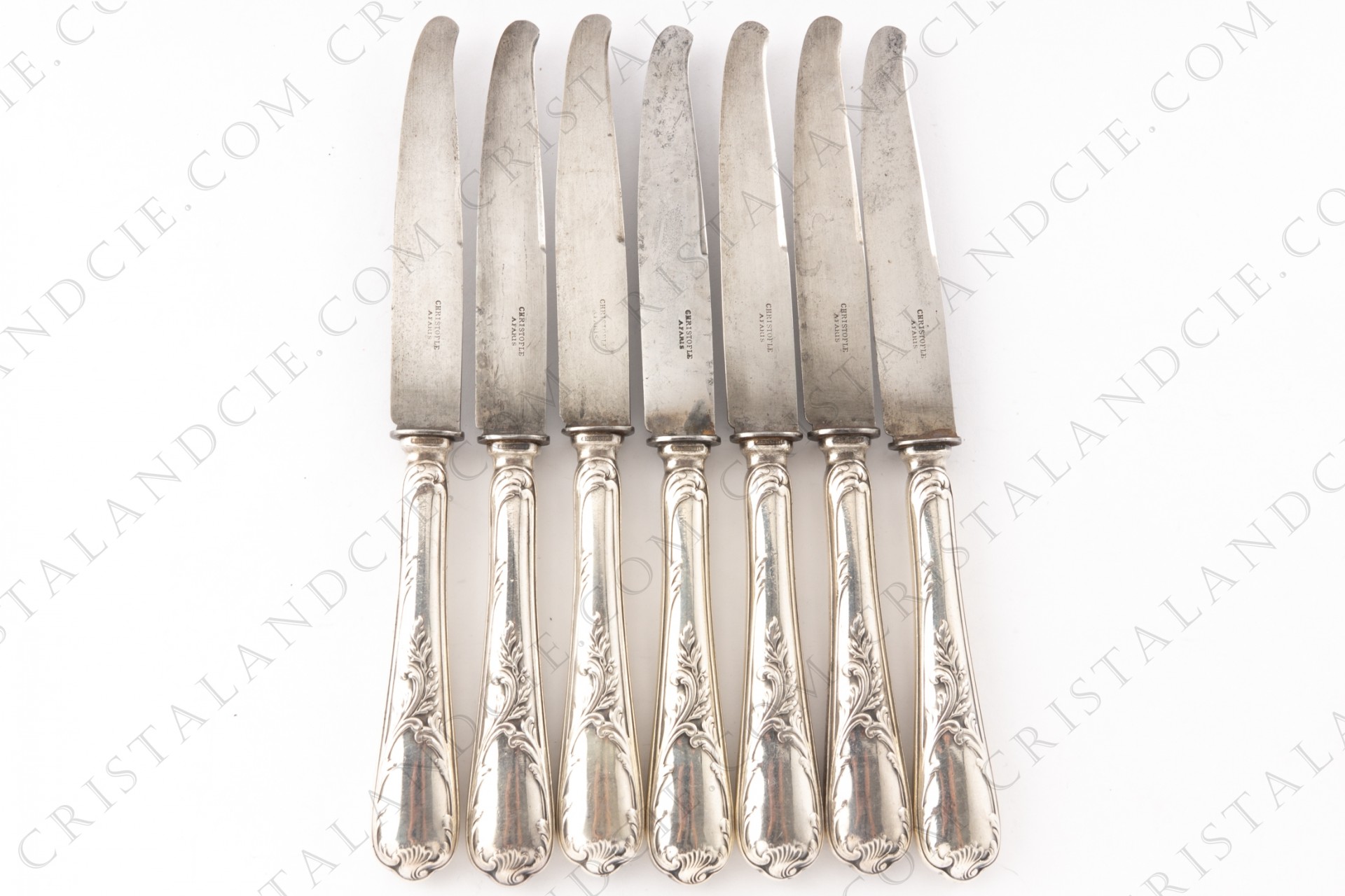 Série de sept anciens couteaux à dessert en métal argenté de la maison Christofle modèle Marly présentant un décor Rocaille. Estampillés.