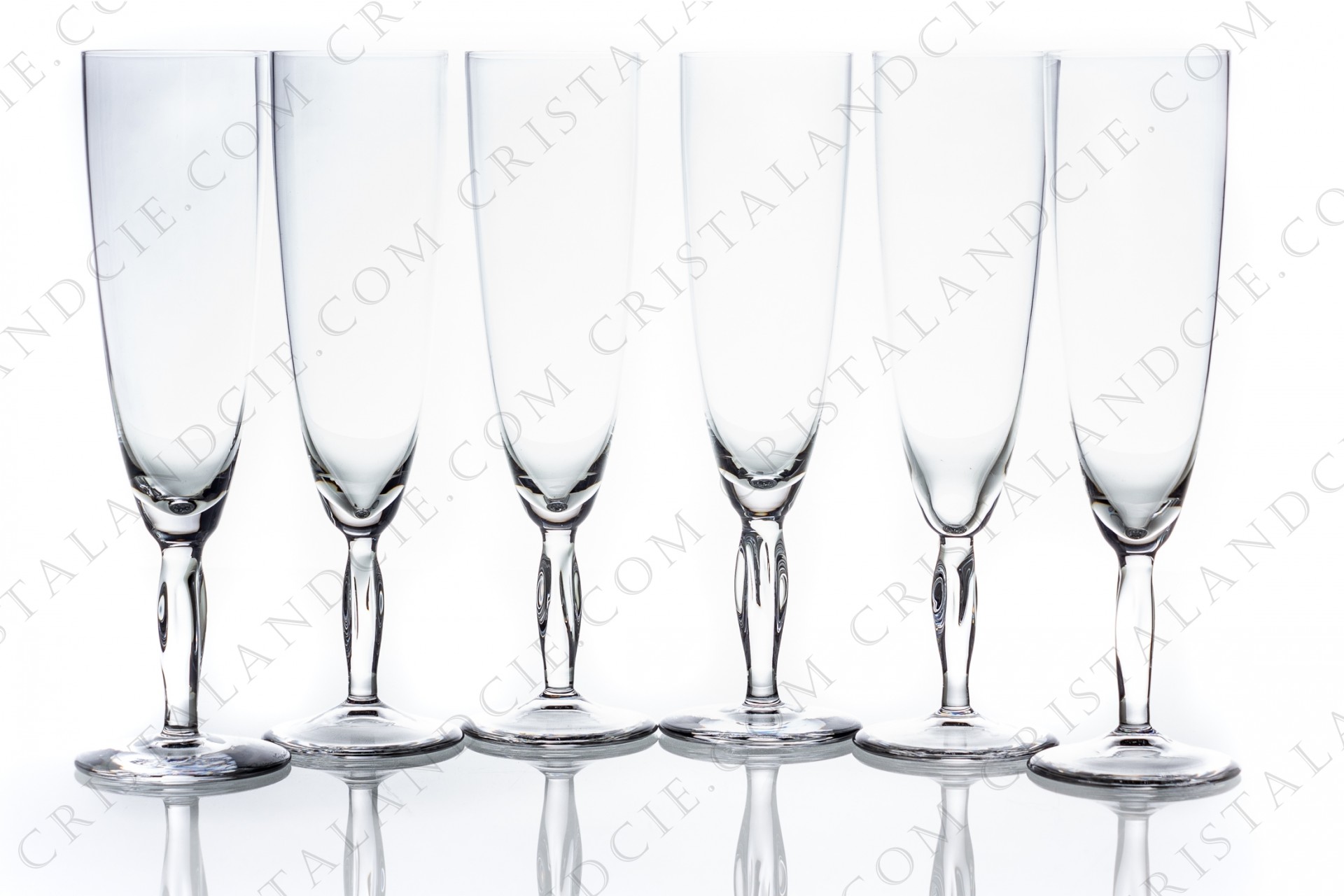 Série de six flûtes à Champagne en cristal de Daum modèle Ovédélia présentant un pied torsadé. Quelques micro-rayures. Ht: 20,7 cm Diam: 5,2 cm.
