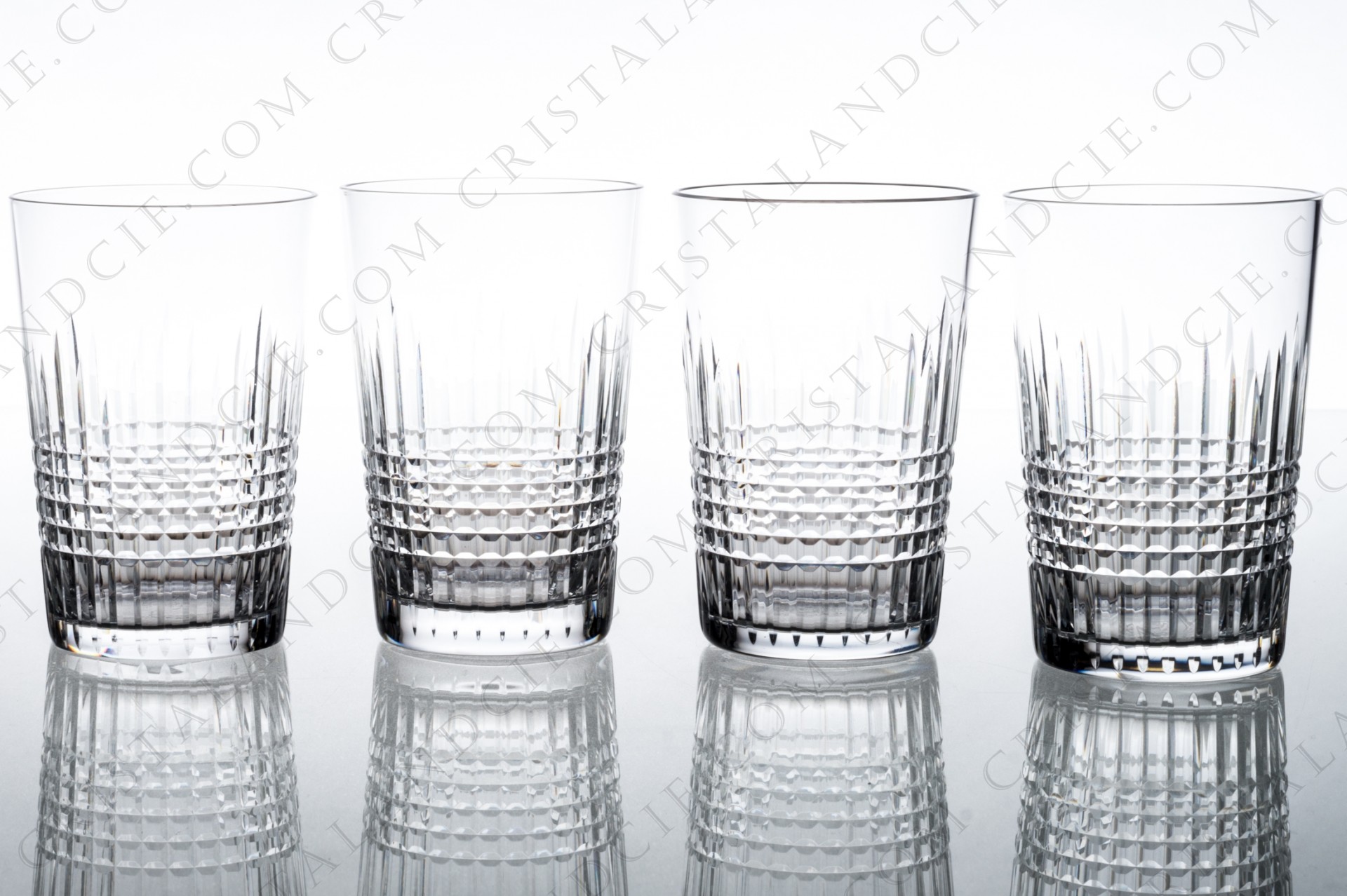 Série de quatre gobelets de forme américaine en cristal de Baccarat modèle Nancy, présentant un important décor taillé de quadrillage. Modèle produit de 1909 à 2002. Estampillés. Rares micro-rayures. Ht: 9,2 cm Diam: 6 cm.