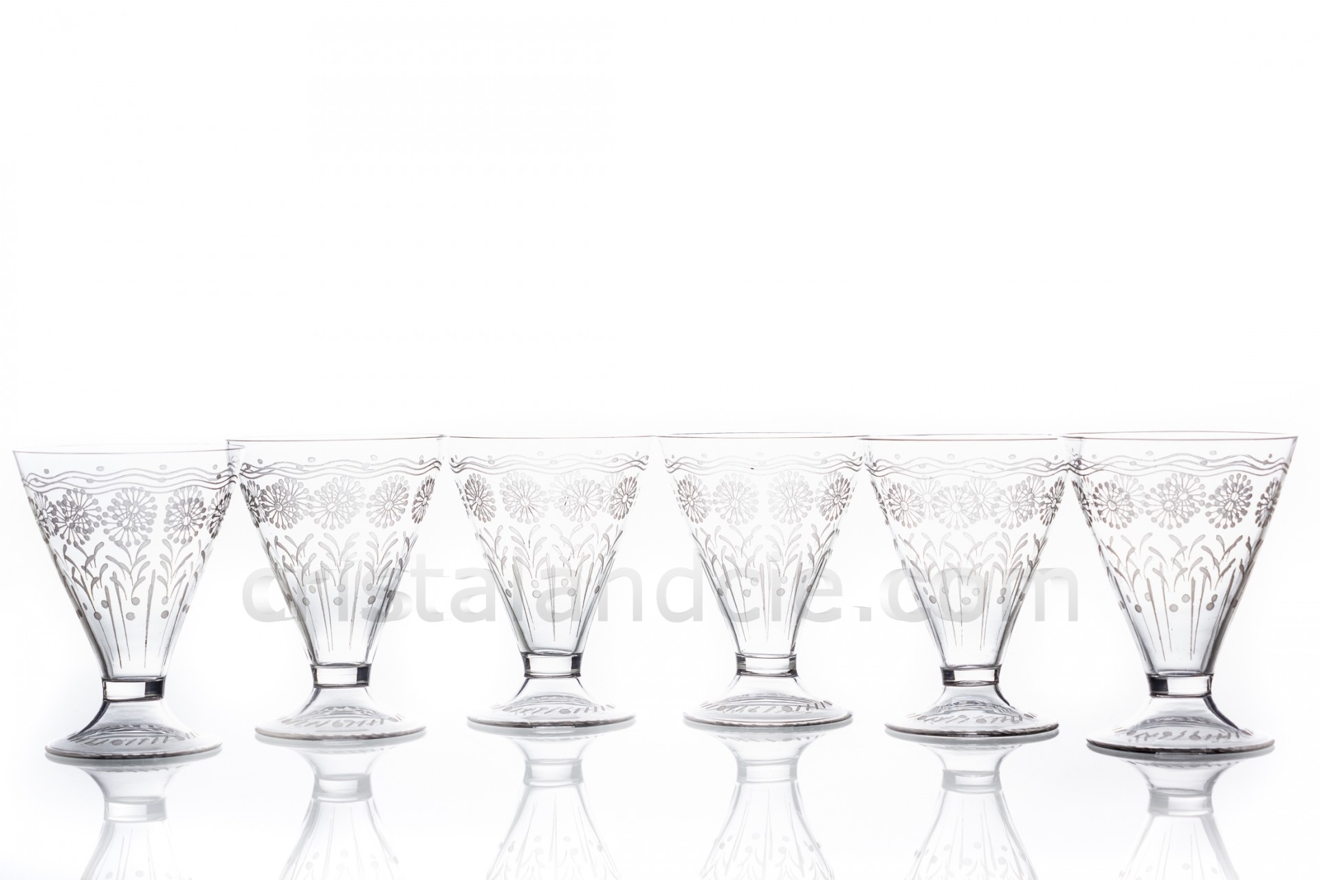 Série de six verres à vin en cristal de Baccarat forme 11965, gravure mate 12117, à décor de fleurs gravé et pied creux. Datant de 1916. Trop anciens pour être estampillés.