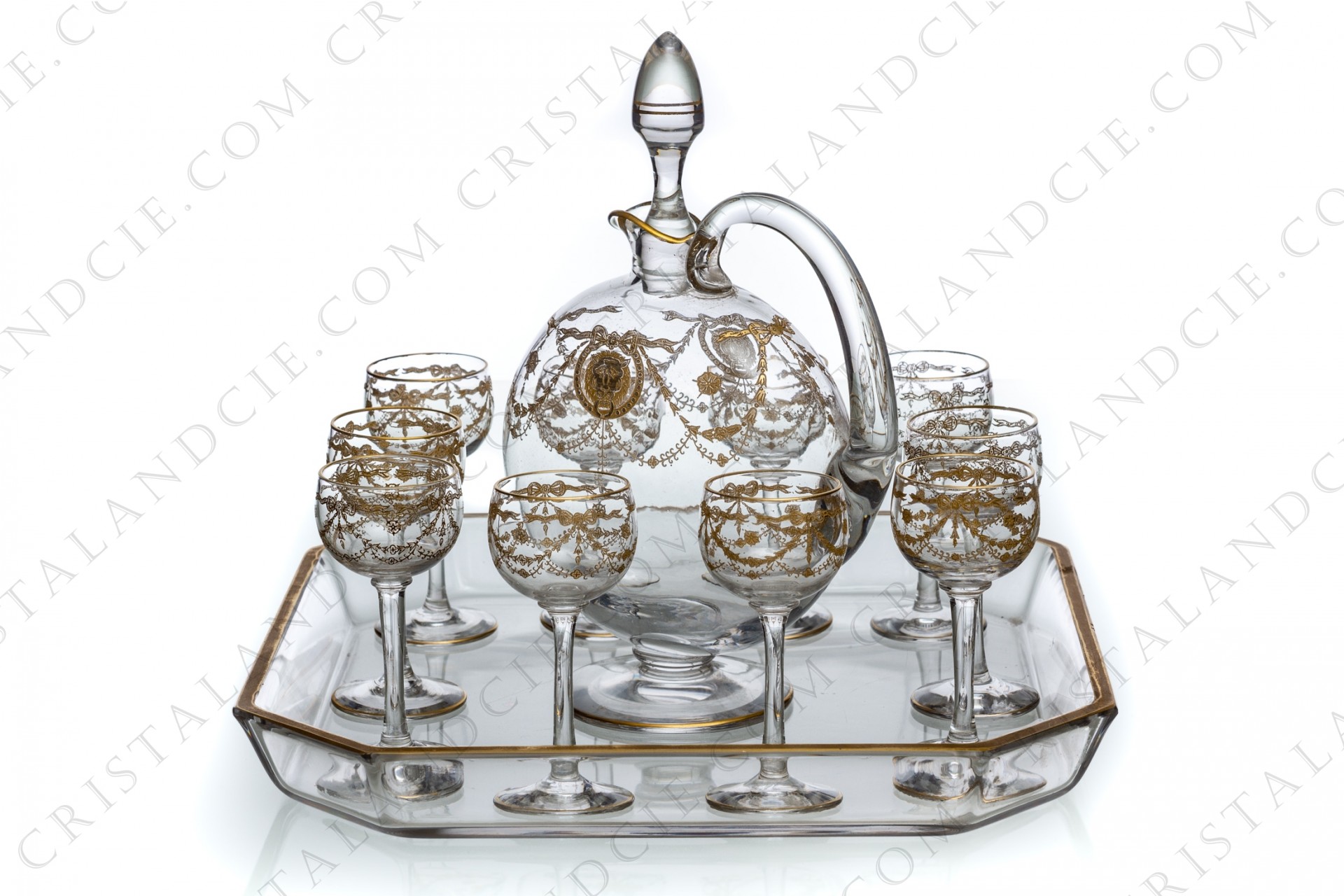Service à liqueur en cristal de Saint-Louis modèle Congress à décor d'incrustations or. Comprenant une carafe, dix verres et un plateau. Trop ancien pour être signé.