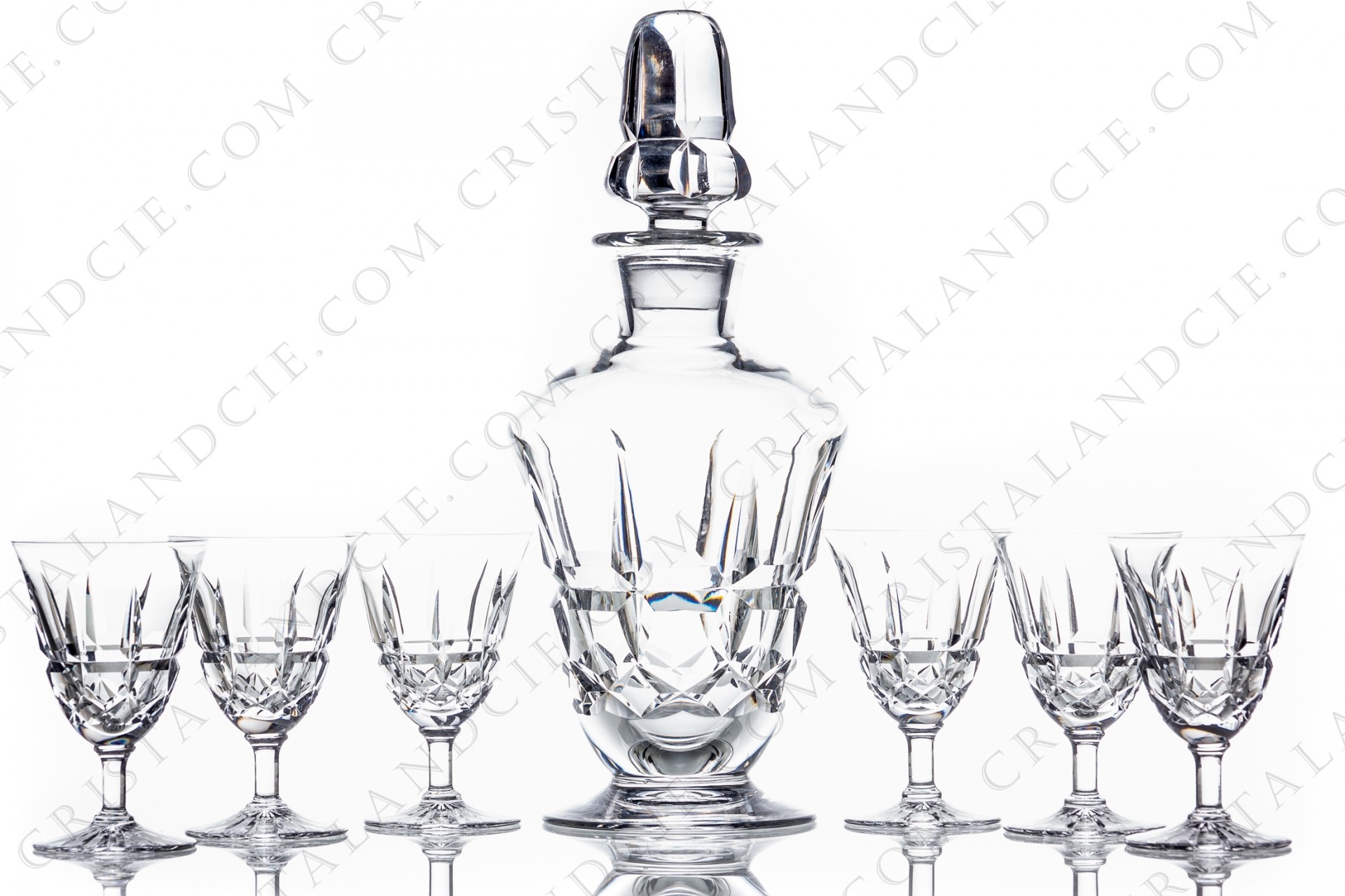 Service à Porto en cristal de Daum présentant un décor taillé. Comprenant une carafe et six verres.