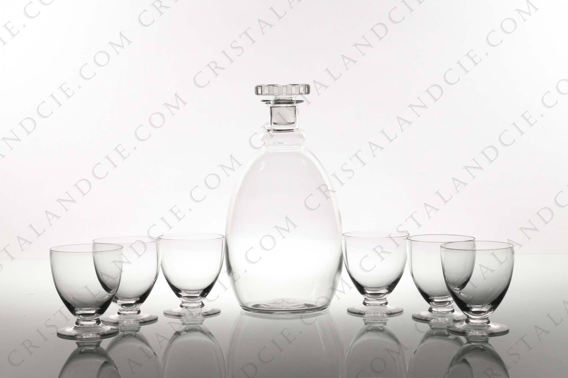 Service à vin en cristal de Daum modèle Briançon à décor Art Déco taillé et dépoli sur le pied et le bouchon. Datant des années 1930. Comprenant une carafe et six verres. Estampillé.