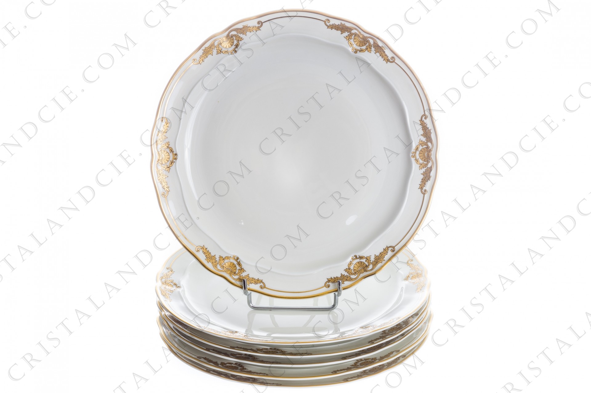 Série de six assiettes plates en porcelaine de Limoges de la maison Bernardaud modèle Coquille à décor de coquilles et arabesques végétales or.