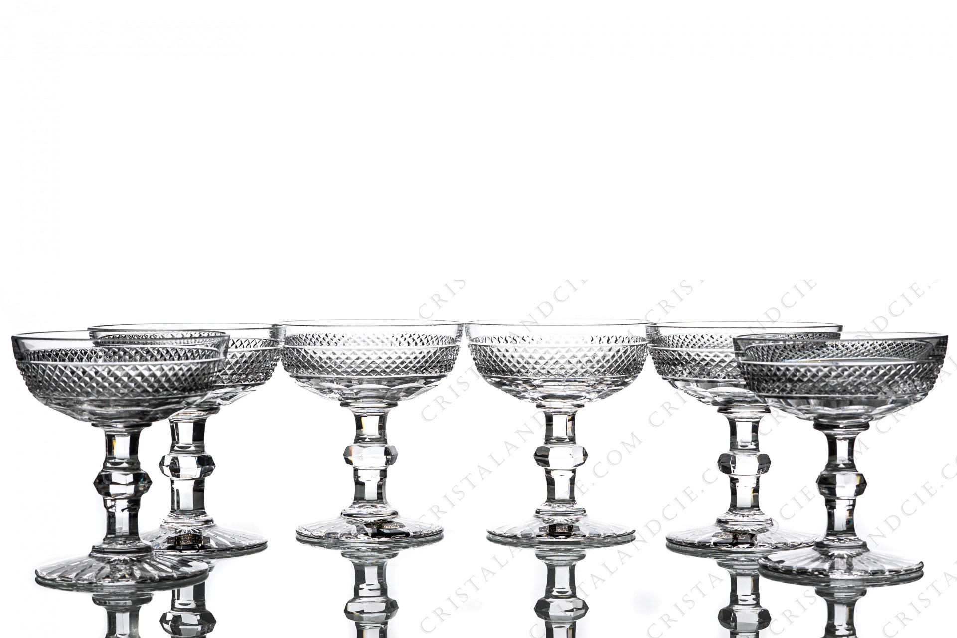 Série de six coupes à Champagne en cristal de Saint-Louis modèle Trianon dont la paraison est ornée de facettes surmontées d'une frise de pointes de diamant, jambe à pans coupés muni d'une bague à mi-hauteur. Modèle créé en 1834, toujours fabriqué chez Saint-Louis. Estampillées, étiquette Saint-Louis sur quatre coupes.