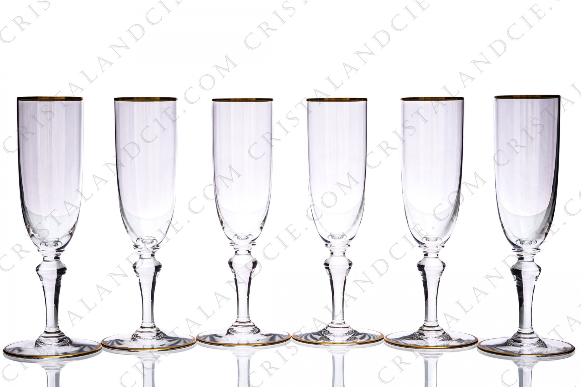 Série de six flûtes à Champagne en cristal de Baccarat modèle Mahora ornées de filets or. Estampillées.
