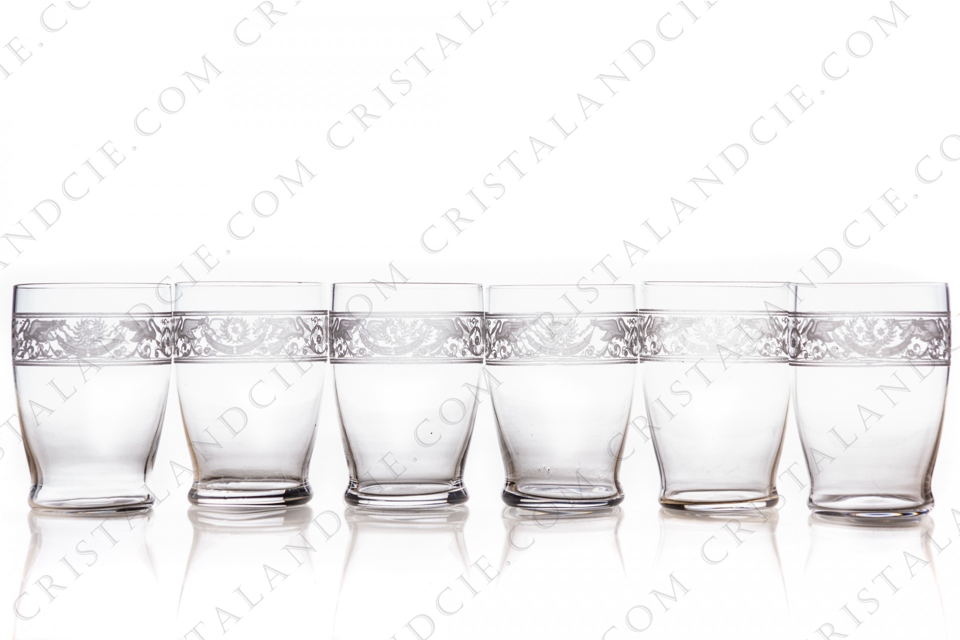 Série de six gobelets en cristal de Baccarat modèle Cygne Empire orné d'une frise gravée à l'acide représentant des amphores, des couronnes de lauriers et des cygnes sur des arabesques fleuries. Trop ancien pour être estampillé, étiquette sur deux verres.