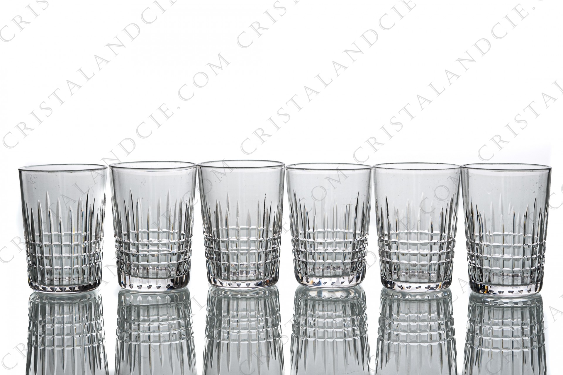 Série de six gobelets de forme américaine en cristal de Baccarat modèle Nancy, présentant un important décor taillé de quadrillage. Modèle produit de 1909 à 2002. Trop anciens pour être estampillés.