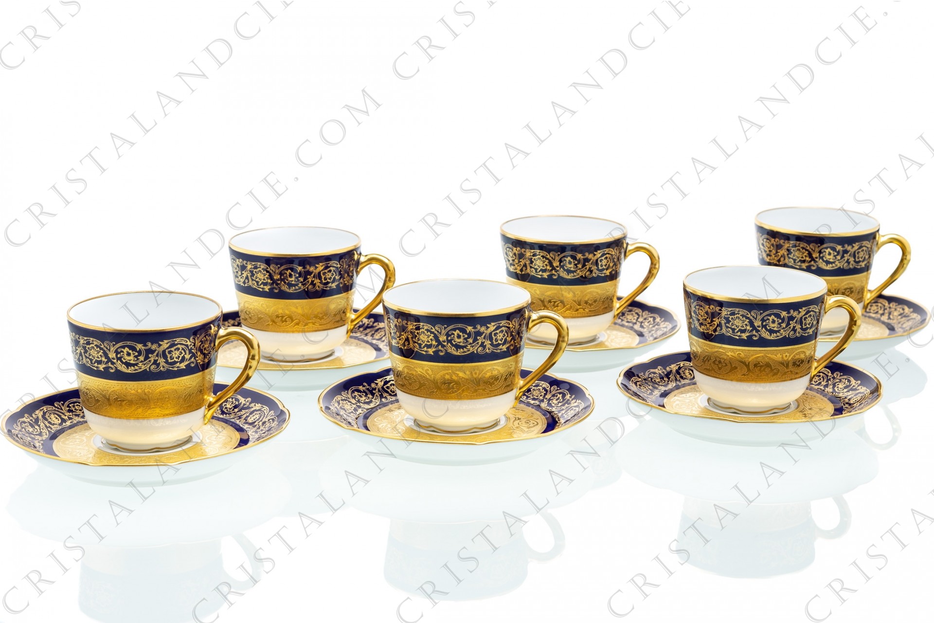 Série de six tasses à café en porcelaine de Limoges de la maison Bernardaud modèle Monte Carlo bleu de four richement décoré d'arabesques fleuries sur fond bleu de four et incrustations or.