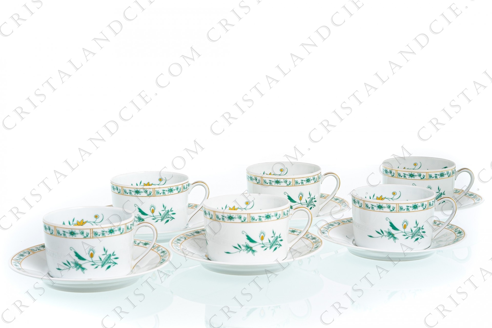 Série de six tasses à thé en porcelaine de Limoges de la maison Bernardaud modèle Pékin ornées de fleurs vertes rehaussées or.