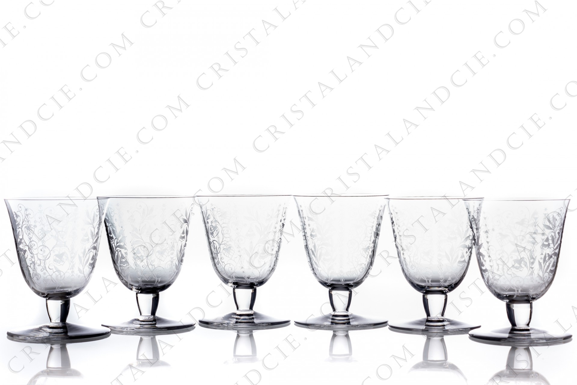 Série de six verres à eau n°2 en cristal de Baccarat modèle Argentina présentant un important décor gravé. Modèle produit de 1943 à 1961. Signature au tampon.