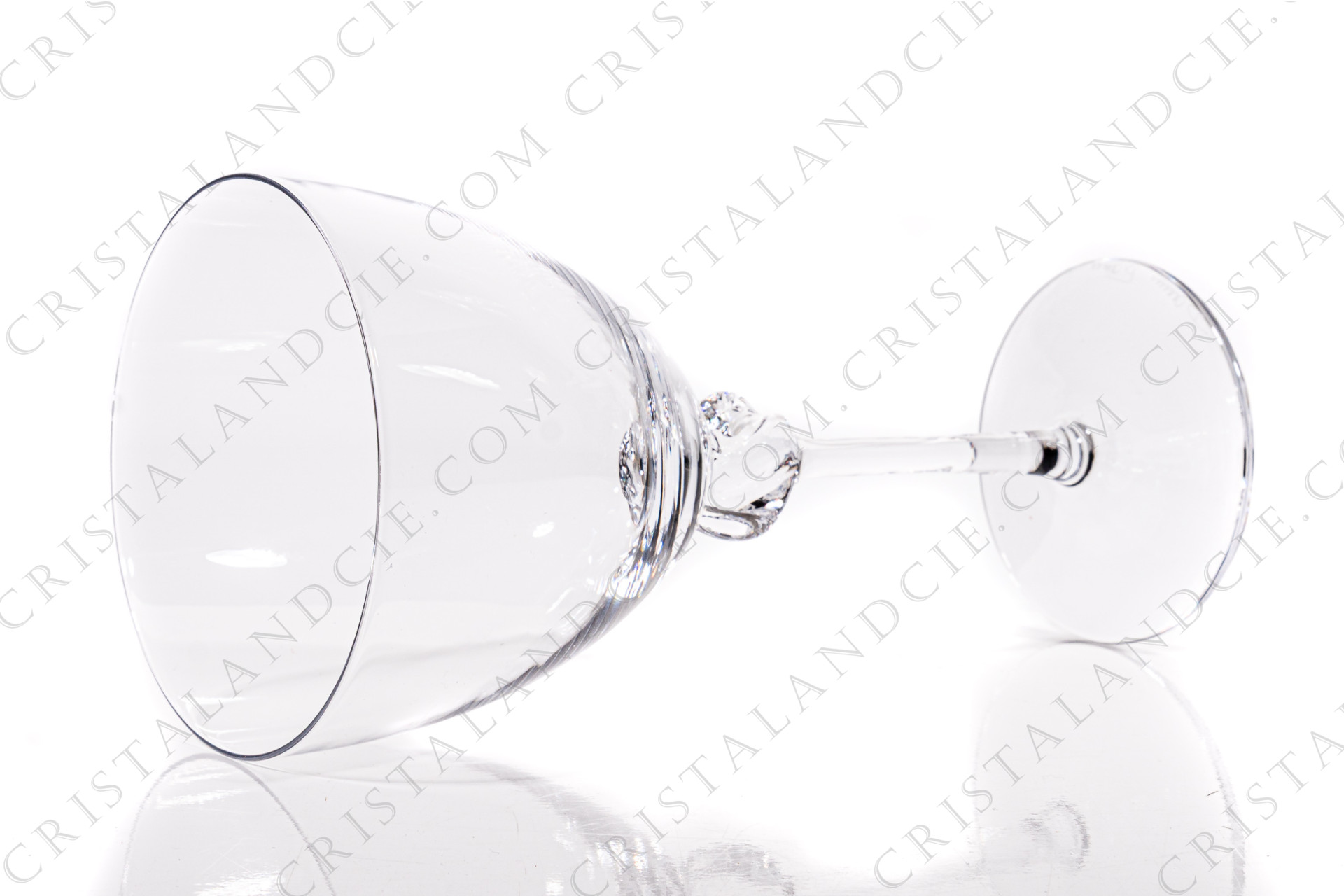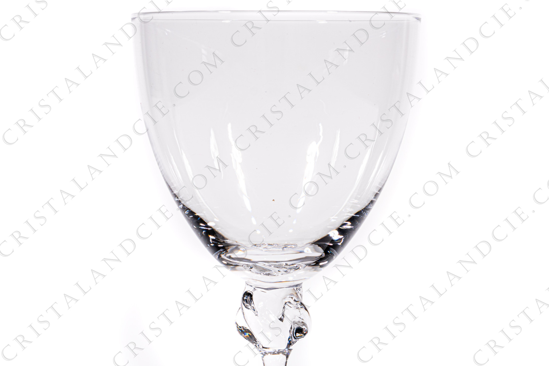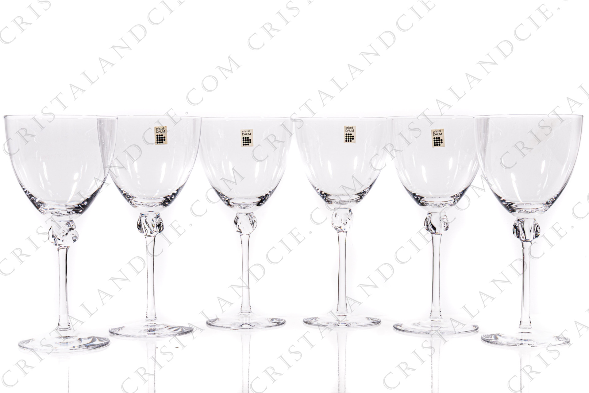 Série de six verres à eau n°2 en cristal de Daum modèle Boléro présentant une bague torsadée sur la jambe. Modèle créé en 1960. Estampillé, étiquette Daum sur quatre verres. Vendus dans leur boite d'origine.