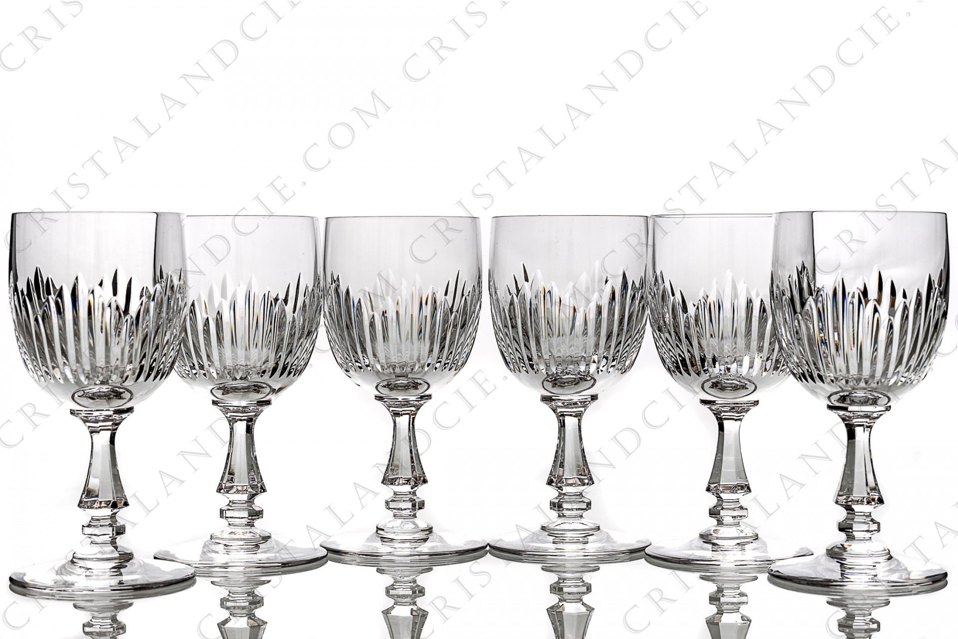 Série de six verres à eau n°2 en cristal de Saint-Louis modèle Liane ornés de biseaux taillés. Modèle créé en 1979. Estampillés. Vendus dans leur boite d'origine.