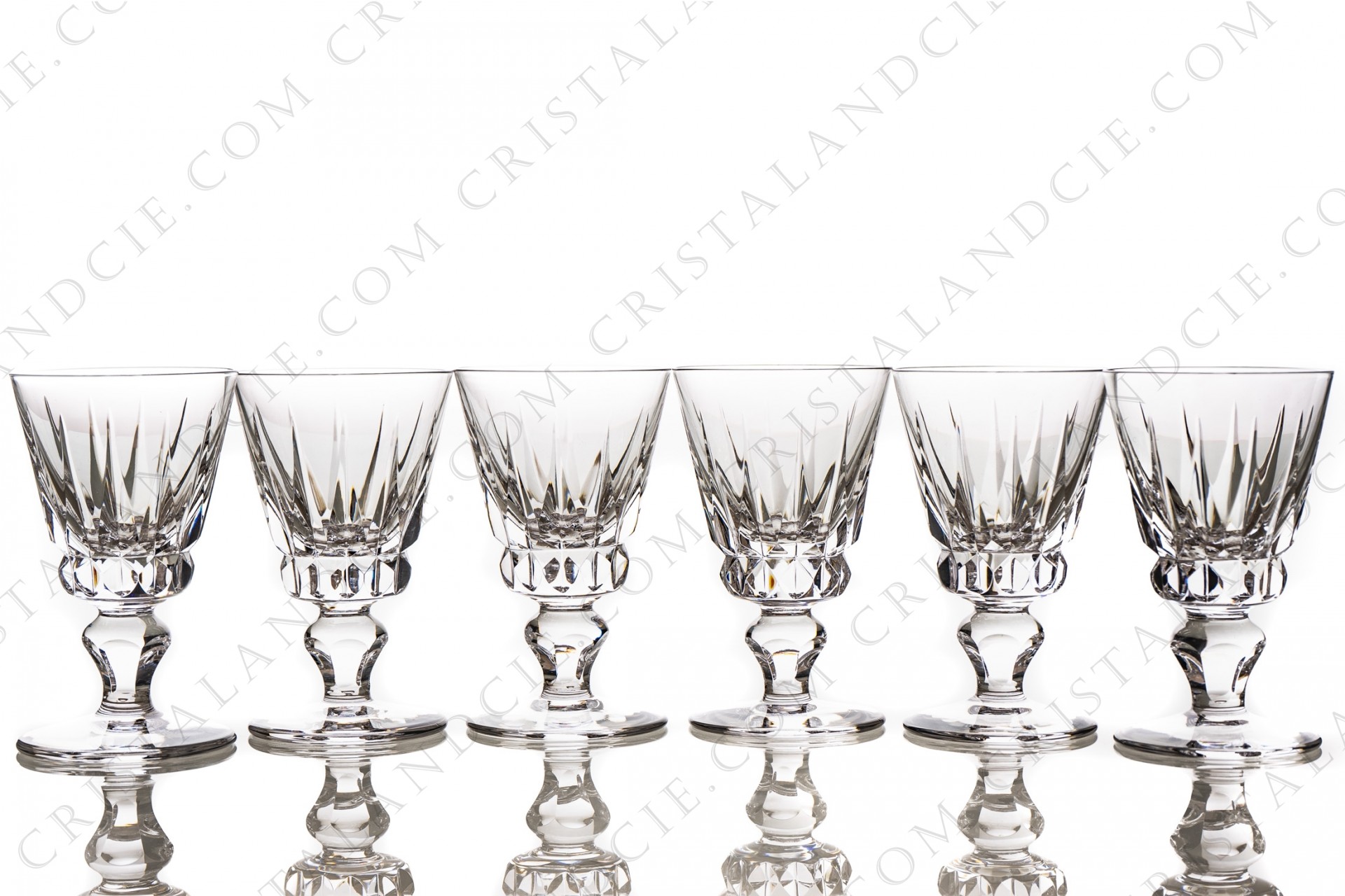 Série de six verres à vin blanc n°4 en cristal de Saint-Louis modèle Guernesey présentant un décor de biseaux taillés sur la paraison. Modèle créé en 1968. Estampillés.