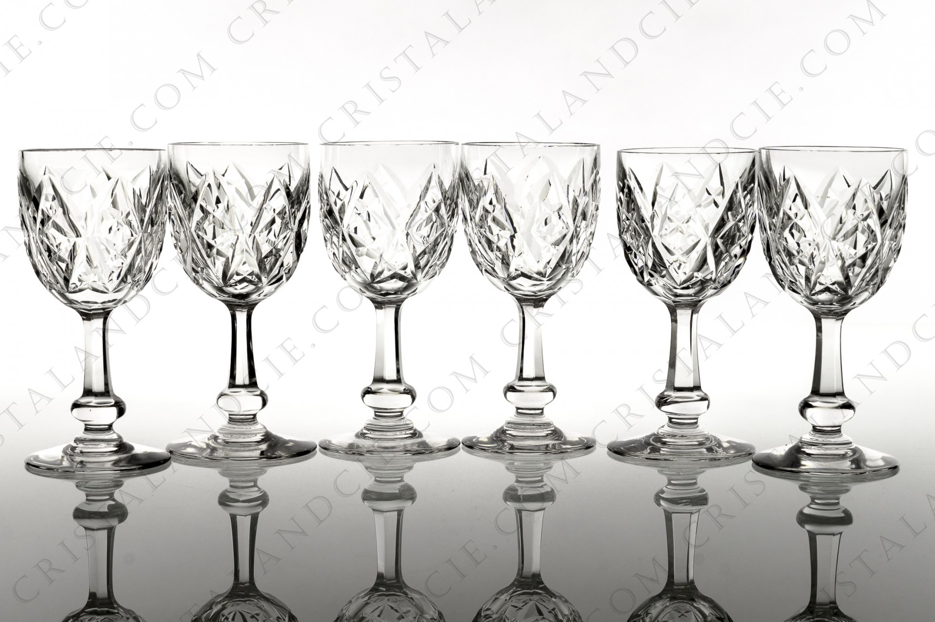 Six verres à vin n°4 en cristal de Baccarat modèle Harfleur présentant un décor taillé sur la panse et le pied. Modèle produit de 1942 à 1961. Rares micro-rayures en dessous. Ht: 12,9 cm Diam: 6 cm.