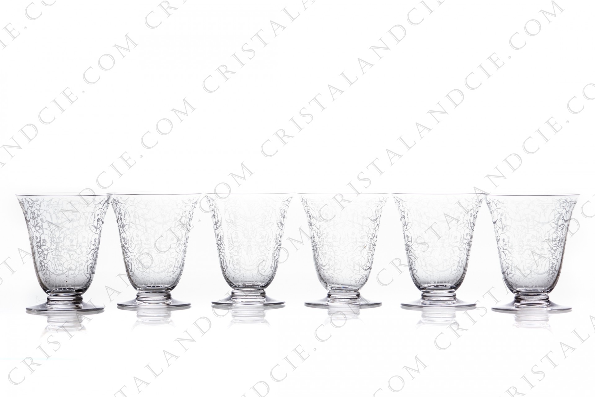 Série de six verres à vin n°3 en cristal de Baccarat modèle Michelangelo présentant un important décor gravé. Modèle produit de 1927 à 1970.