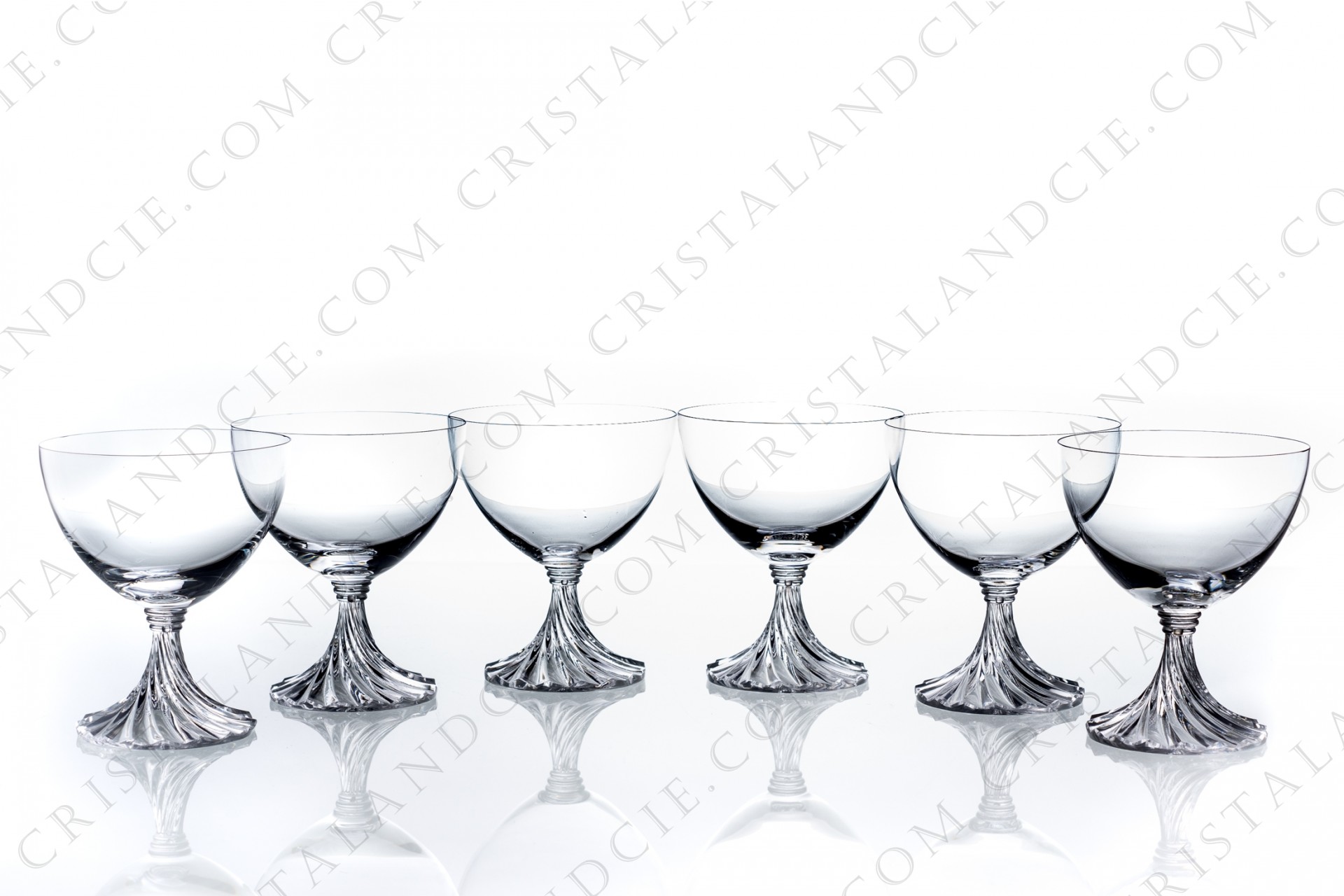 Série de six verres à vin n°3 en cristal de Lalique modèle Rambouillet à jambe torsadée.