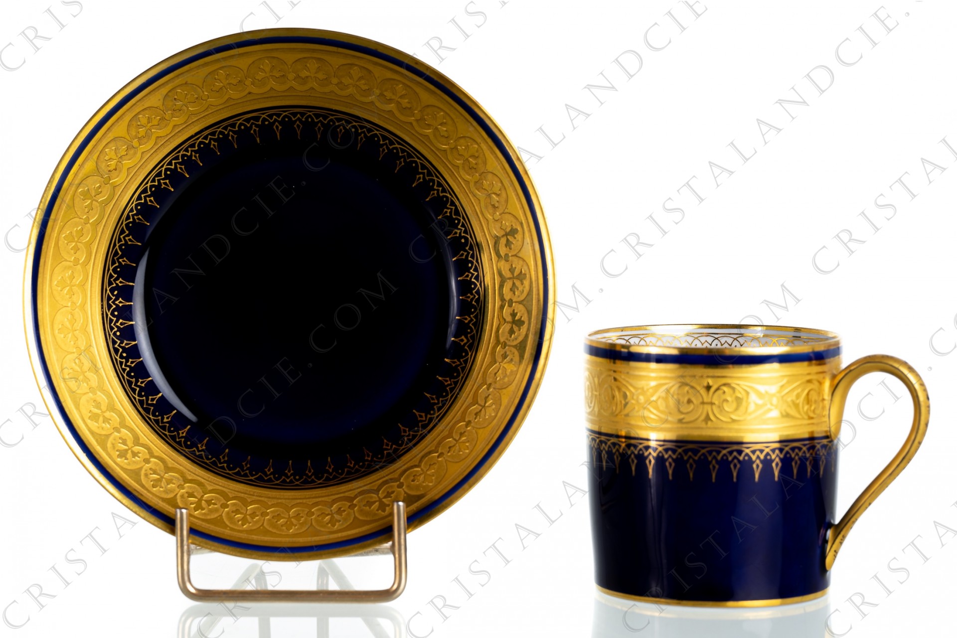 Tasse litron en porcelaine ornée de frises de rinceaux en incrustations or sur fond bleu de four, anse décorée d'une frise peinte à la main sur fond or mat. Datant de la fin du XIXè- début du XXè siècle.